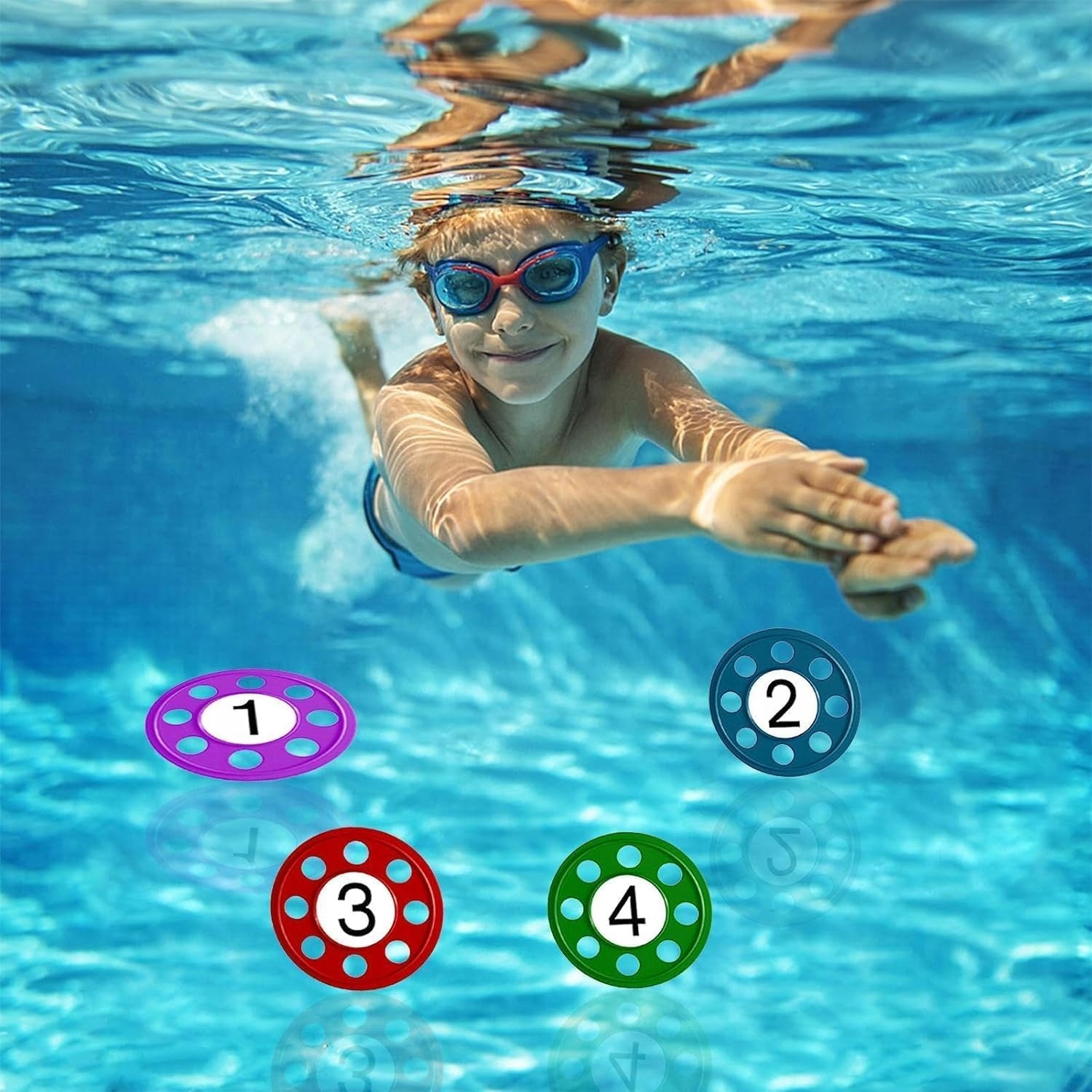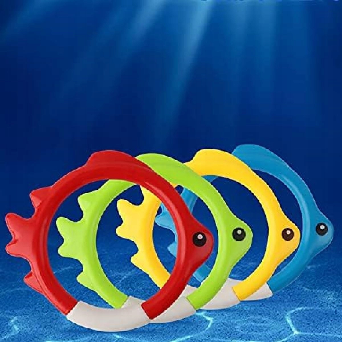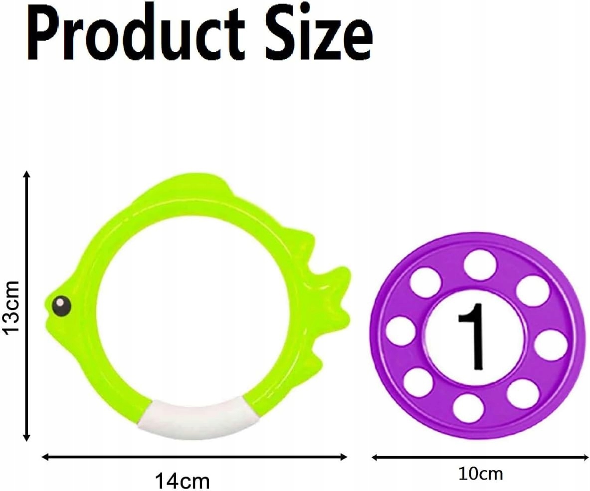 Набір включає 4 кільця для пірнання та 4 диски/фрісбі насичених кольорів, які легко помітити під водою.