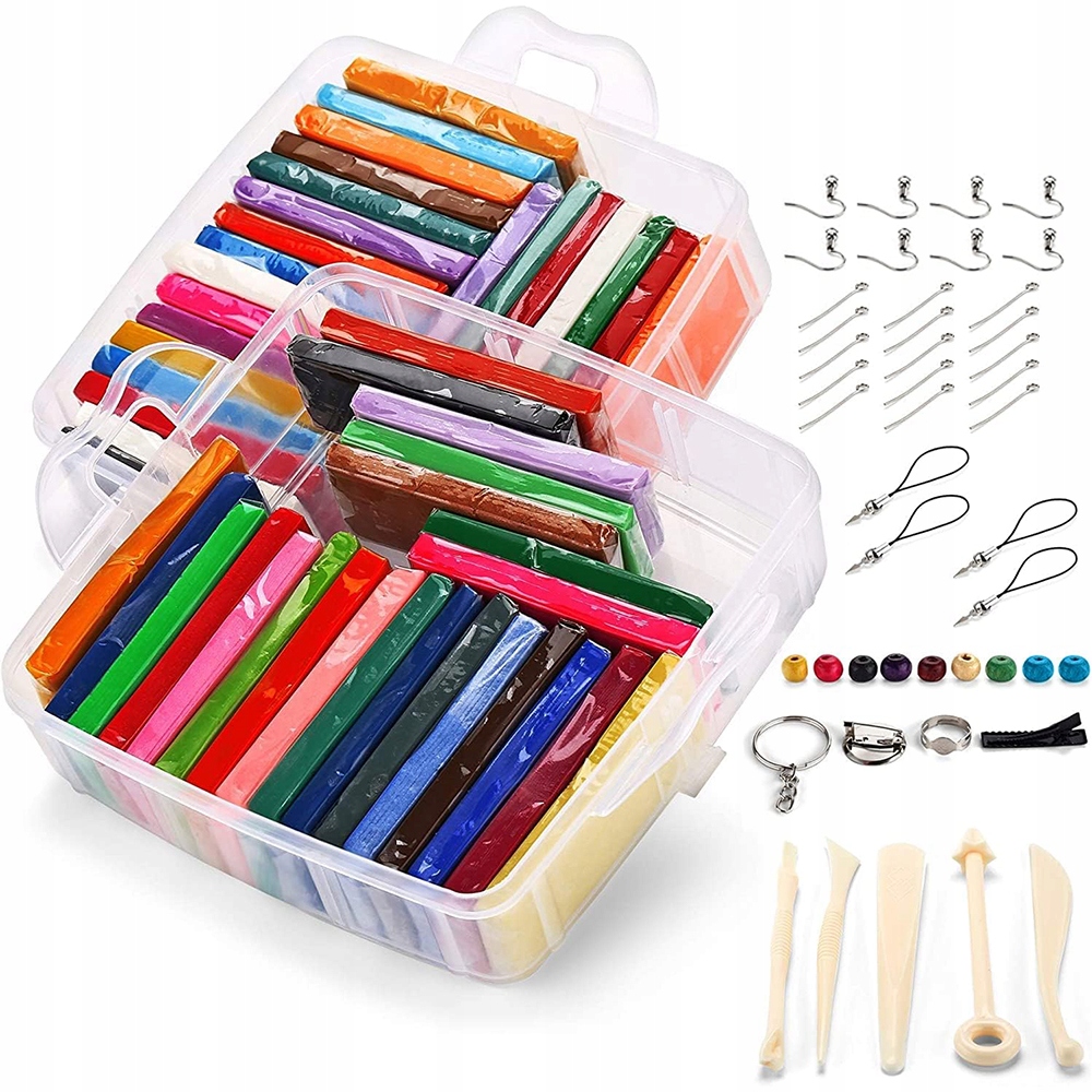 - 46 кольорових шматочків випаленої в печі глини для ліплення, 1 двошарова коробка для зберігання, 5 інструментів для ліплення та 40 аксесуарів для ювелірних виробів.