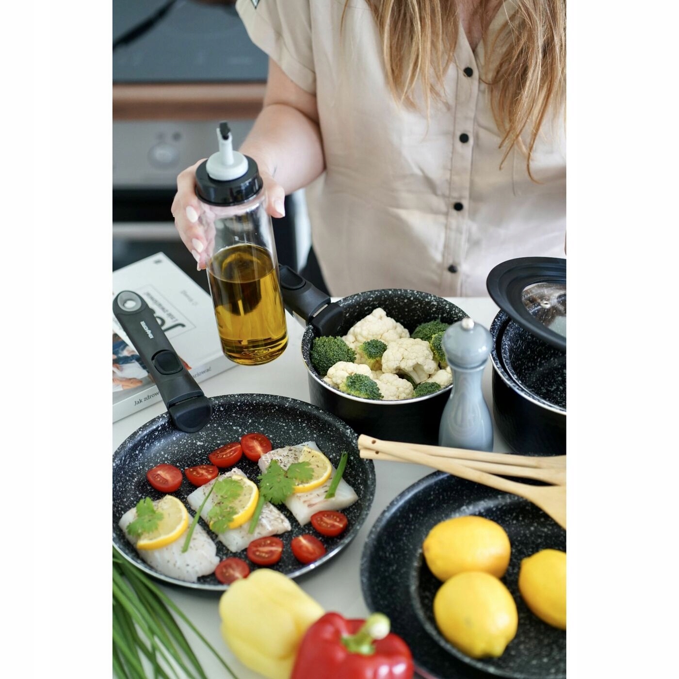 Це робить його ідеально збалансованим і зручним. Його підвищену міцність забезпечує покриття GREBLON C3. Його висока якість, твердість і 3-шарова структура були розроблені німецькою компанією WEILBURGER. Він також позначений як PFOA Free. Енергозбереження забезпечує індукційне дно. Антипригарне покриття також дозволяє смажити з невеликою кількістю жиру та легким доглядом. Він може витримувати до 8000 циклів стирання, що в чотири рази більше, ніж звичайний антипригарний посуд, доступний на ринку. Перенесення та використання набору полегшує бакелітова ручка, яка повільно нагрівається та надійно лежить у руці. З його допомогою розмістити посуд в кухонній шафі або ящику буде набагато легше. З цим набором ви легко створите власний набір кухонного посуду для домашнього використання та для всієї родини.