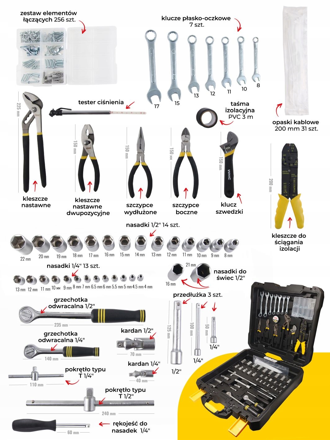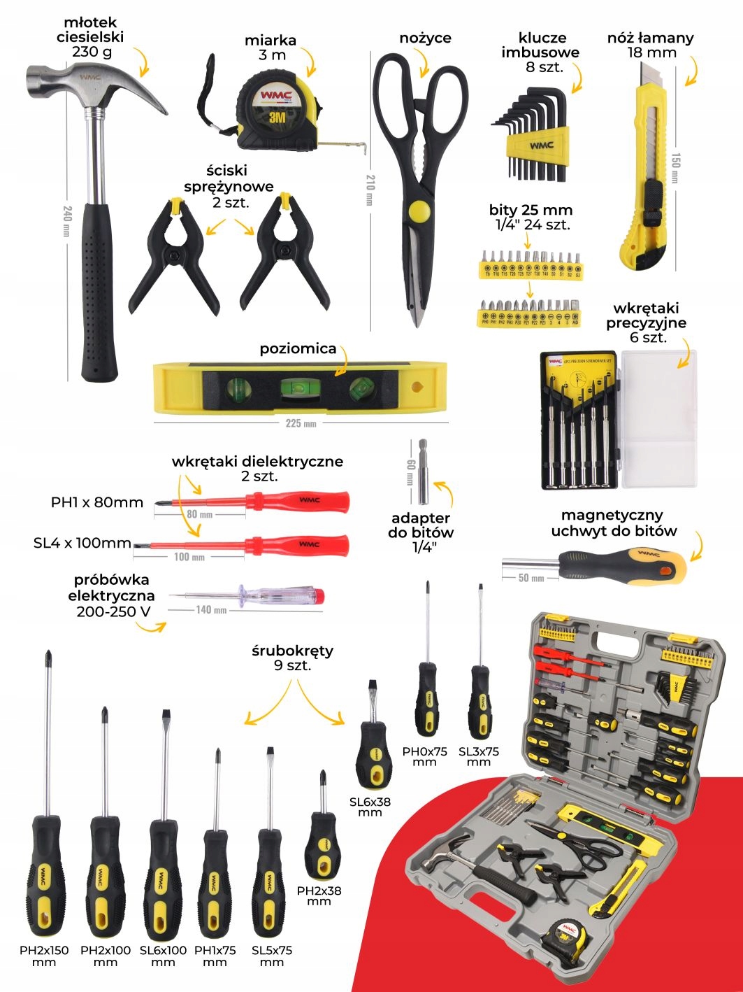 Інструменти підібрано таким чином, щоб вміст коробки був таким же практичним, як можливо. Тому ми подбали про те, щоб набір дозволяв вам виконувати такі завдання, як: