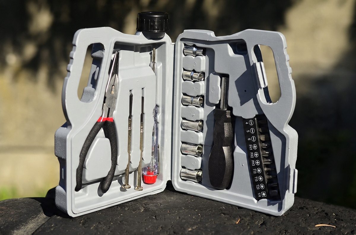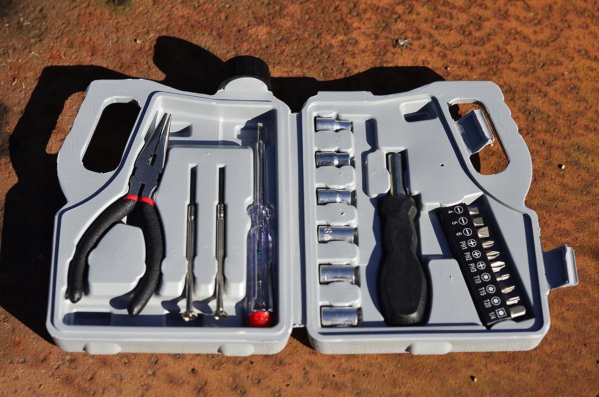- набір включає: плоскогубці універсальні, прецизійні викрутки (плоска та хрестова), викрутка та набір 9 біт (плоска, хрестова та Torx) та перехідник на шість торцевих біт (від 5 до 10 мм), тестер напруги (так званий неоновий) та плоска викрутка в один