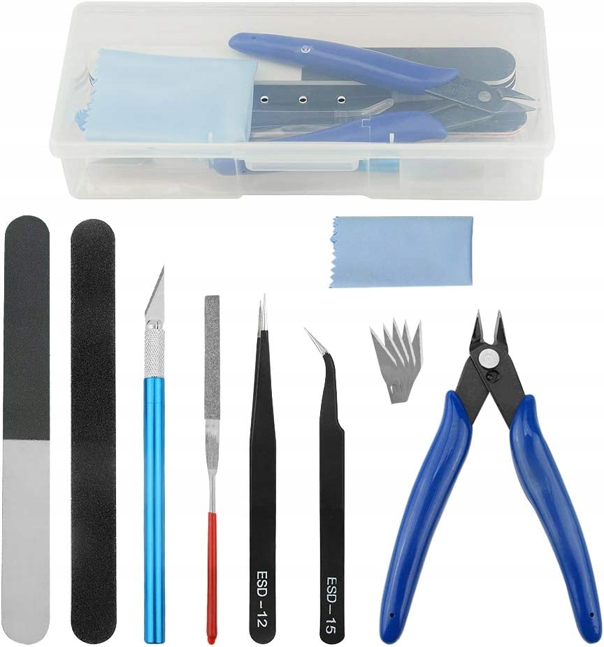 - Різні набори інструментів: пакет включає 1 x бічні кусачки, 2 x пінцети, 1 x напилок, 2 x двосторонні полірувальні палички, 1 х полірувальна тканина, 1 х скальпель і 5 х лез, 1 х прозора коробка.