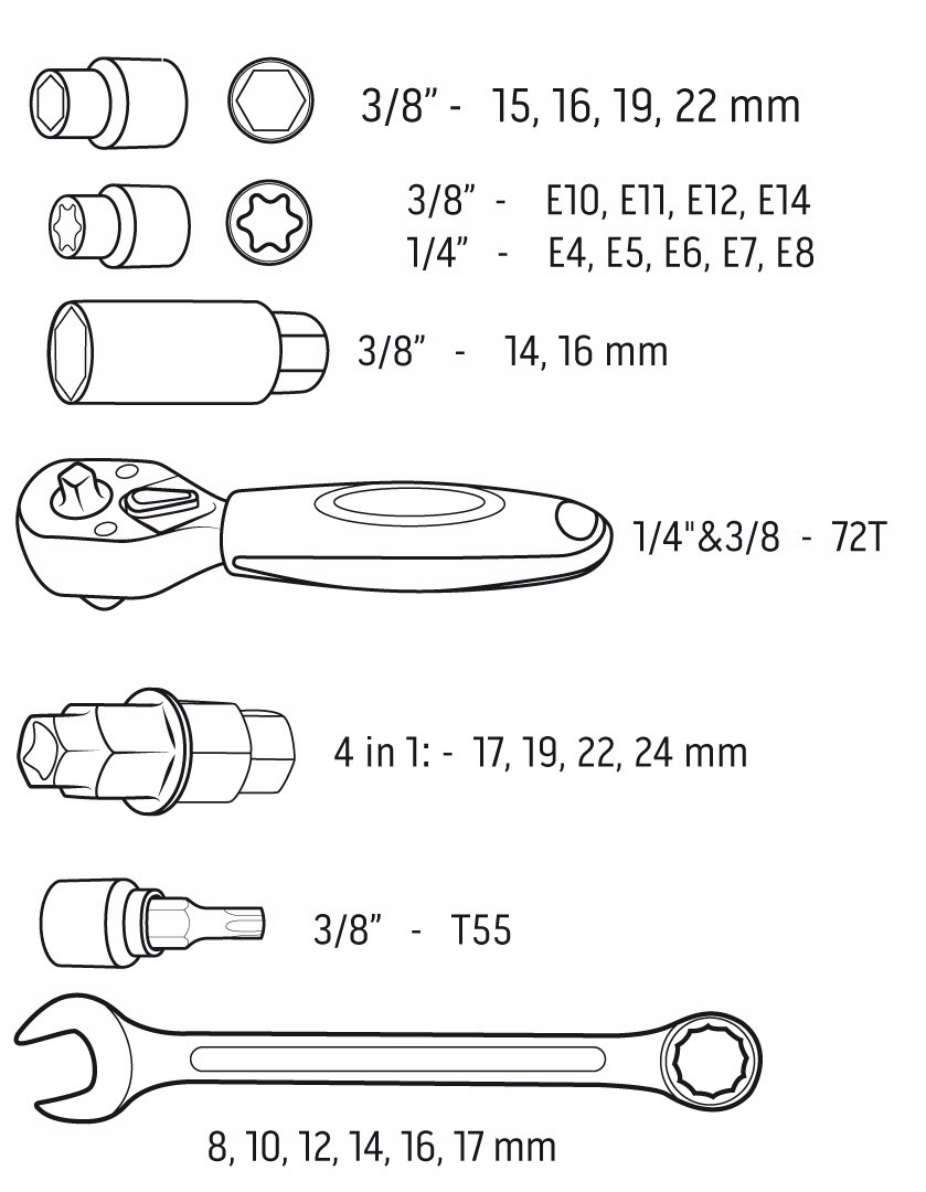 - вкладення в наборі: 3/8 "torx, 4 pc.: E10, e11, e12, e14