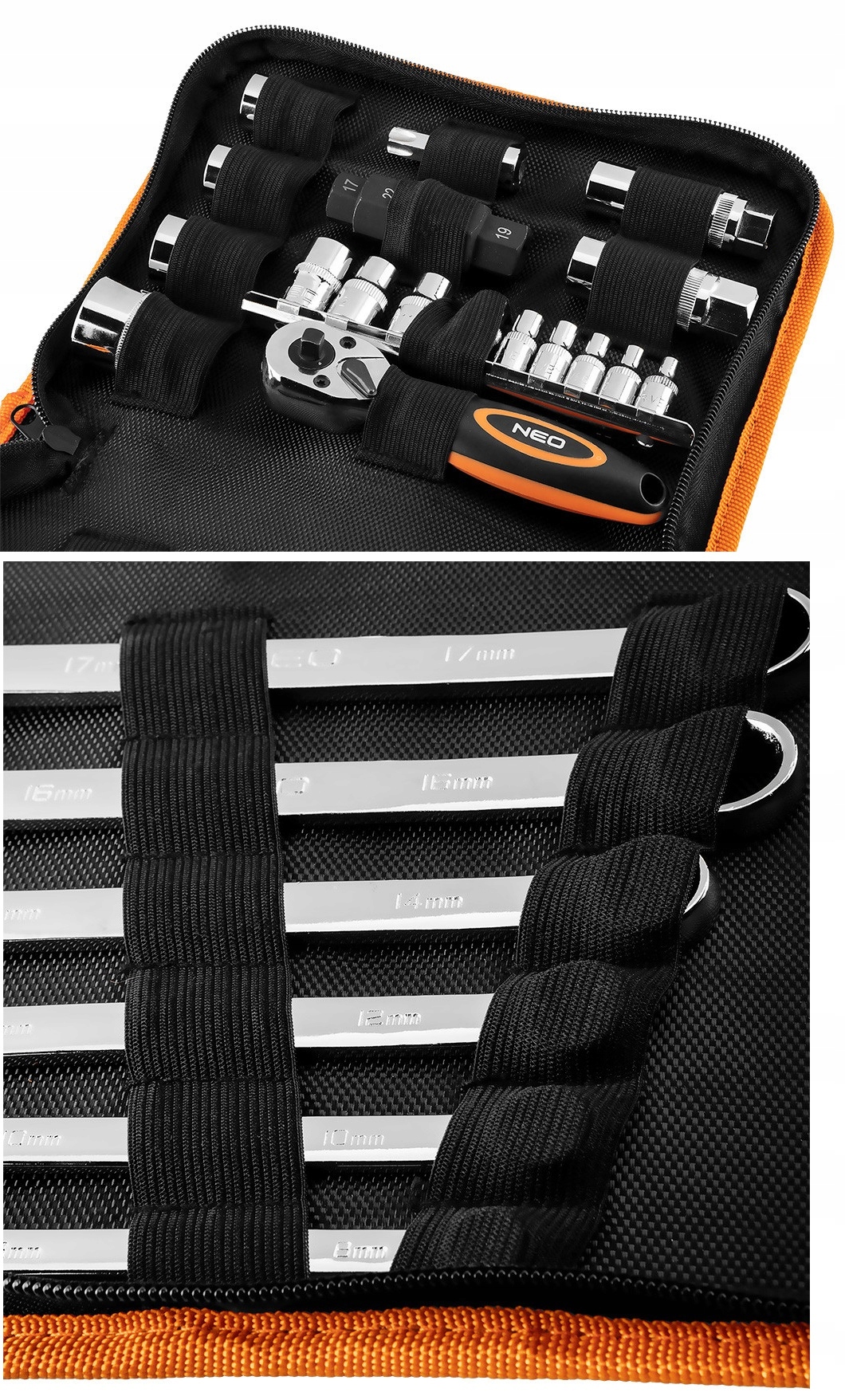 Набір інструментів для мотоциклів, 25 штук, м'який випадок 10-500 Neo-це набір, що складається з 25 елементів, виготовлених зі сталі CS і пропонується в м'якому практичному випадку. Набір включає: Клавіші плоских охв 5 штук у розмірах: 8, 10, 12, 14, 16, 17 мм; 3/8 шестикутні шапки "4 штуки розміром: 15, 16, 19, 22 мм; Torx 1/4" шапки розміром: E4, E5, E6, E7, E8; Torx 3/8 "Кап 3/8 Свічки Шапки "2 штуки розміром: 14, 16 мм; брязкальця 1/4" & 3/8 "72 зуби; інструмент для мотоциклів 4 у 1 розміри: 17, 19, 22, 24 мм.