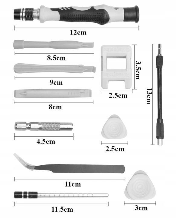 Набір був розроблений для відкриття телефонів, планшетів, навігації, камер, ноутбуків та всіх інших приладів RTV , в яких є не стандартні гвинти. (нікель -нікель) . Завдяки цьому ви можете бути впевнені, що вони постійні .