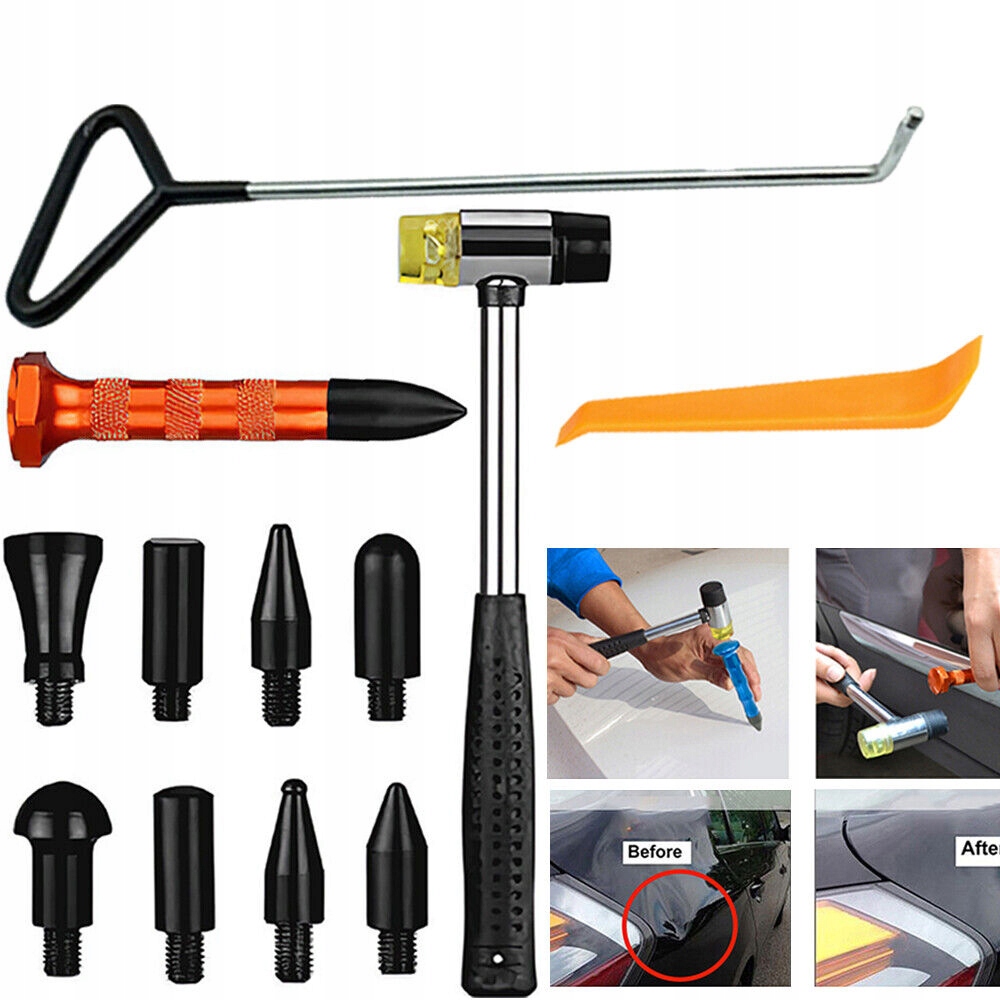 Чорна головка молотка виготовлена з високоякісної сталі з високою твердістю, її нелегко зламати та довговічна. Оснащений 12 різними формами наконечників, ви можете вибрати потрібну залежно від розміру вм’ятини чи вигину.