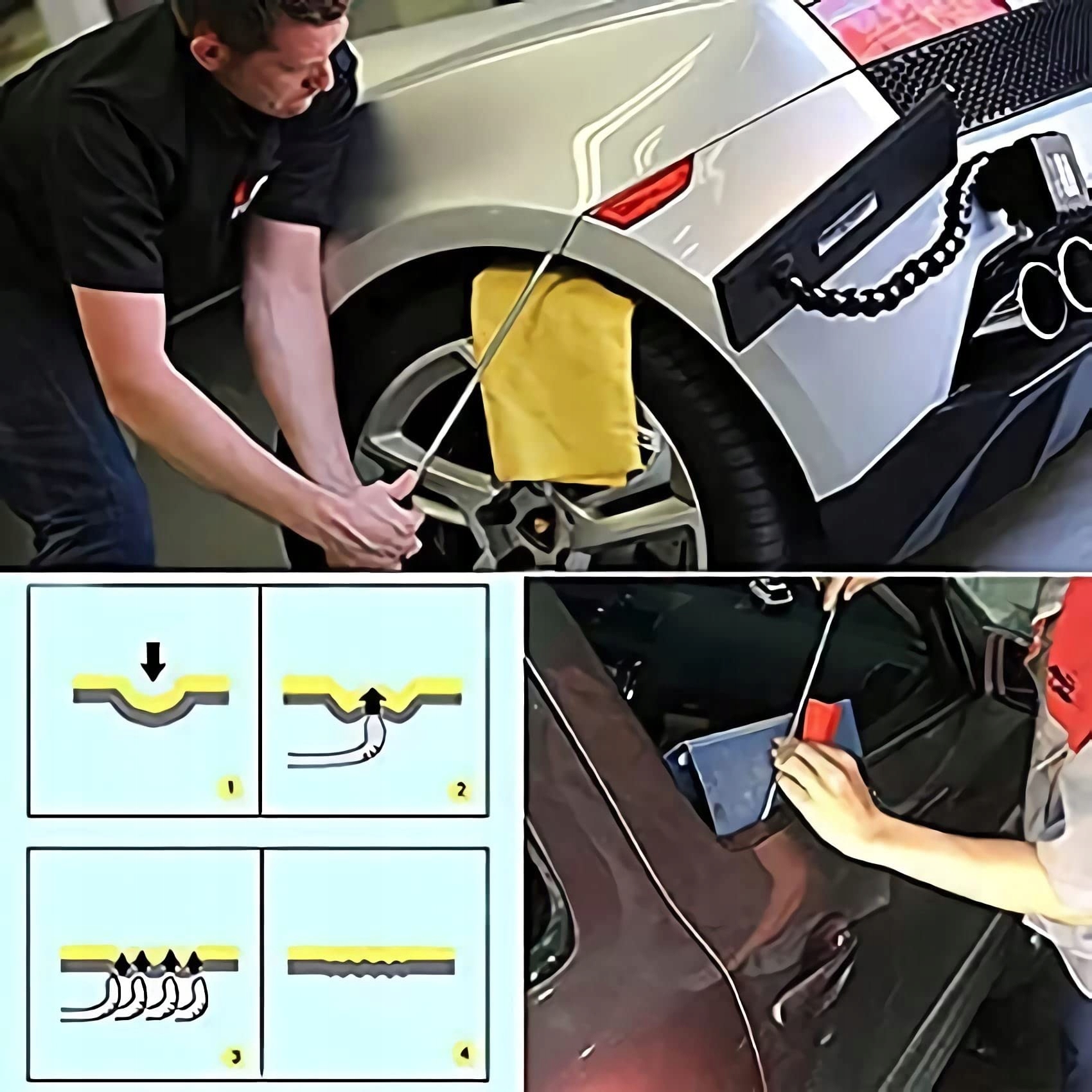 УДАЛЕННЯ ВМЯТИН БЕЗ БАРБИ: Це видалення вм’ятин на 100% без фарби. Нижня частина інструменту для видалення вм’ятин виготовлена з гуми і не пошкодить оригінальну фарбу. Після видалення вм’ятини засобом для видалення вм’ятин можна розпилити залишки клею 90% або вищим спиртом, щоб повністю видалити залишки клею, не пошкоджуючи оригінальну фарбу.
