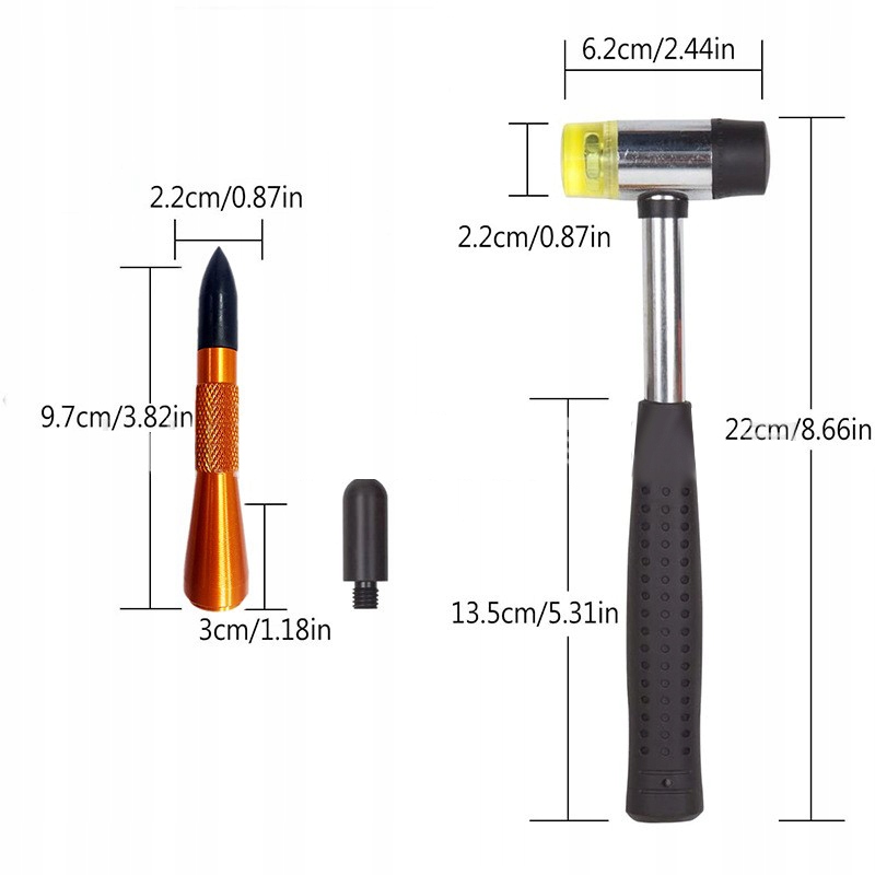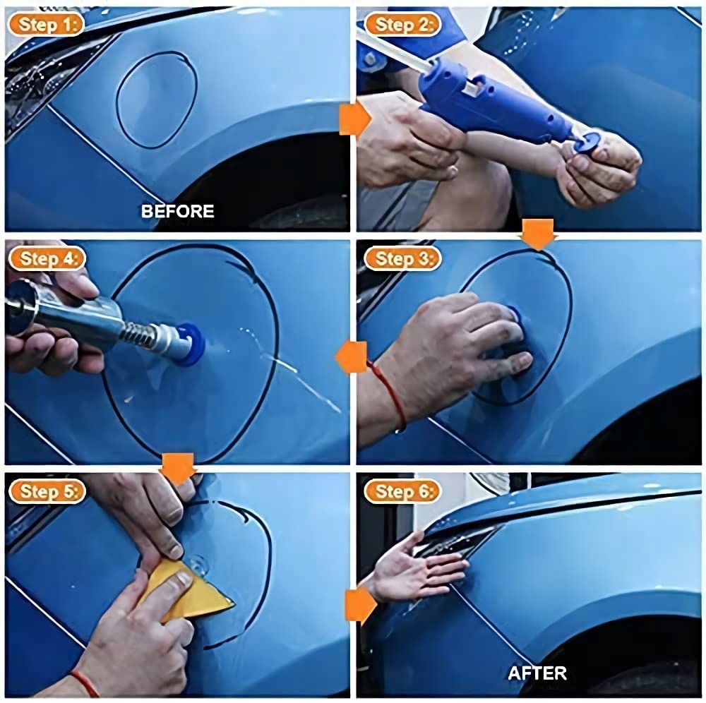 НОВЕ ОНОВЛЕННЯ: На відміну від більшості наборів для ремонту вм’ятин на ринку, ми додали нову присоску для видалення вм’ятин, яка підходить для ремонту деяких великих вм’ятин. Ми також пропонуємо манжети різних форм і розмірів, які товщі та легко ламаються. У той же час ми посилили адгезію наших клейових стрижнів, і тепер можна видаляти вм’ятини у важкодоступних місцях кузова.
