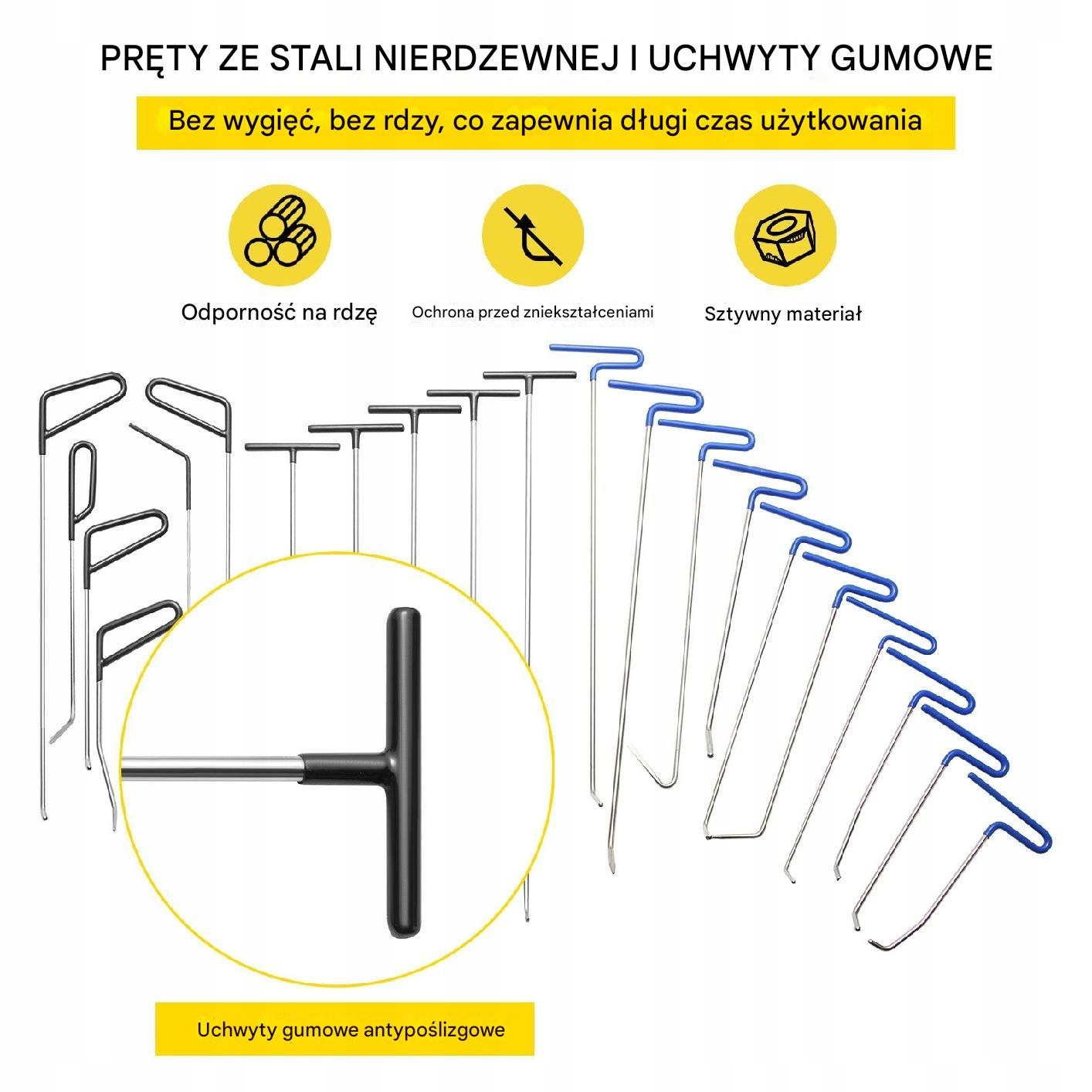 Поновіть зовнішній вигляд тіла з професійним набором PDR, що містить 21 стрижня для видалення вм'ятин! Ідеально підходить для ремонту автомобілів, мотоциклів, холодильників або пральних машин, не пошкоджуючи оригінальний лак. Оснащений стрижнями довжиною 22-82 см та практичною сумкою для зберігання, забезпечує точність та комфорт . Інвестуйте в інструмент для любителів та професіоналів!