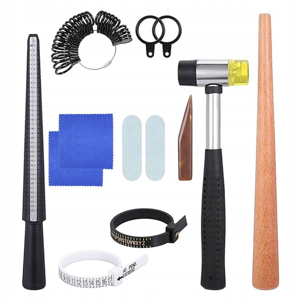 Набір включає: 2 полірувальні серветки, 1 вимірювальний інструмент, 1 гумовий молоток, 1 дерев’яна паличка молотка, 2 шпильки для кільця, 2 полірувальні стрижні, 1 полірований агат і 1 набір круглих моделей – усе, що вам потрібно, щоб почати свою пригоду з виготовлення ювелірних прикрас!