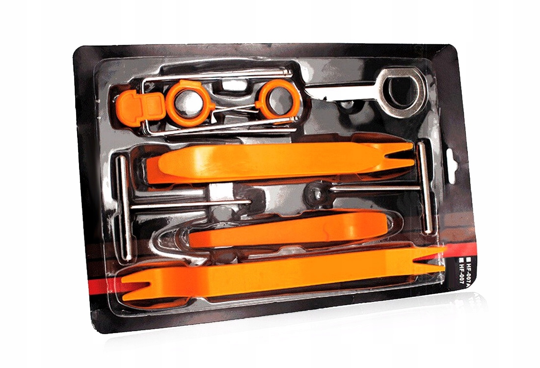 Матеріал, з якого виготовлені інструменти, підібрано таким чином, щоб під час демонтажу елементів салону автомобіля вони не були пошкоджені та не залишали слідів, наприклад, на оббивці. В набір також входять гайкові ключі для демонтажу найпопулярніших заводських магнітол таких фірм, як VW SEAT SKODA AUDI OPEL FORD та ін.