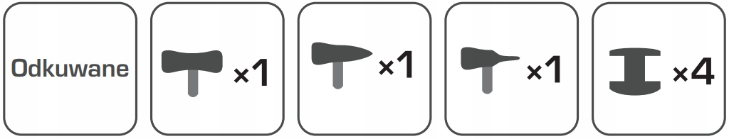 - Набір із семи частин листового металу, який включає молотки з характерними площинами та ковадла різної форми, дугоподібні та опуклі.