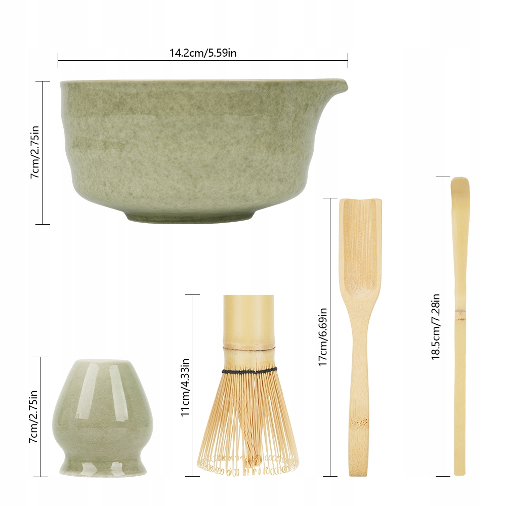 1. Ідеальний набір для матчі: наш набір для матчі включає керамічну миску (500 мл), керамічне блюдце (висота 7 см), мішалку (висота 11 см), ложку для матчі (довжина 18,5 см) і ложку (довжина 17 см). Усі п’ять елементів виготовлені з високоякісних, міцних матеріалів.