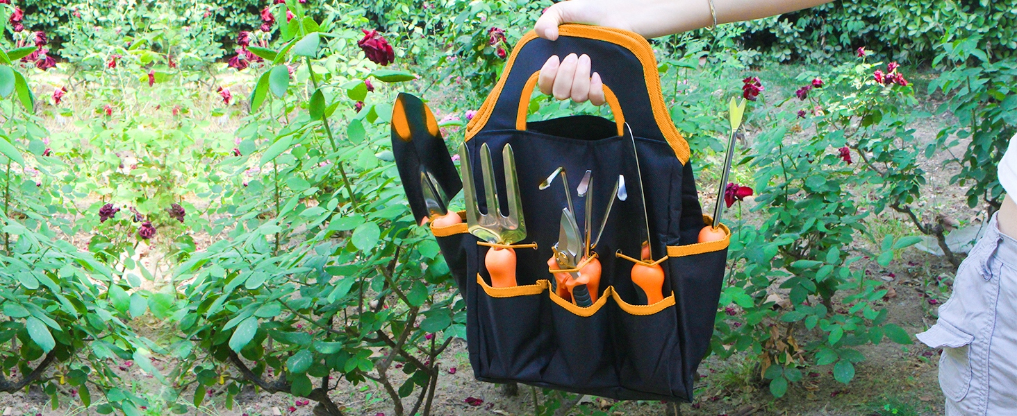 Цей набір інструментів для садівництва містить додатковий садовий мішок для зберігання та транспортування всіх інструментів. Кожен інструмент має отвір для висячого, що полегшує зберігати або повісити швидкий та організований доступ.