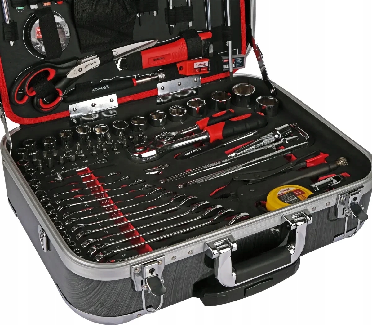 Набір включає широкий спектр інструментів - від гайкових ключів, свердел і плоскогубців до насадок, мірок, маркерів і складальних елементів. Завдяки цьому валіза Schmith SCASE буде добре працювати в будь-якій майстерні, гаражі, монтажній компанії або будівельному майданчику. Всі елементи виготовлені з міцних матеріалів, що гарантує надійність і тривалий термін служби.