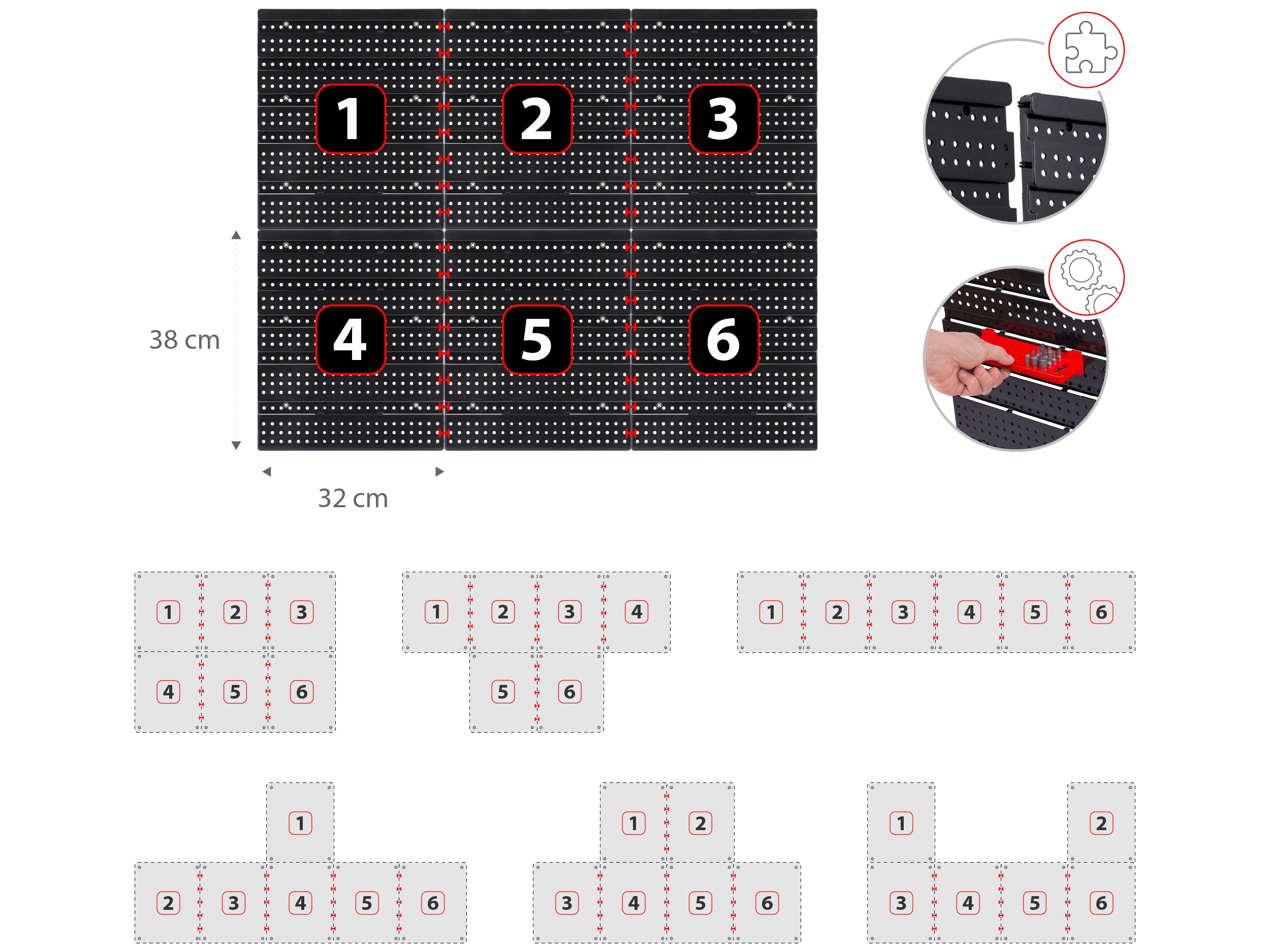 Плата інструментів має модульну структуру, завдяки якій ви можете вільно підключити панелі та адаптувати систему до ваших потреб. Проста збірка дозволяє швидко та зручно поєднати окремі елементи, а різні комбінації забезпечують гнучкість в організації робочого простору.