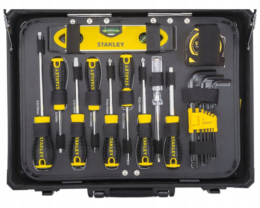 - Нижня кришка: комбіновані рожкові ключі 8-9-10-11-12-13-14-15-16-17-19 мм, торцевий ключ ¼” STMT82663- 0 , ¼" перехідник біт ¼" універсальний шарнір, ¼" трубчасті подовжувачі 75-150 мм, комплект біт 1-13-902 (FL 4-4,5-5,5-6-8 мм, PH 0-1-2 (2x )-3(2x)-4(2x), PZ 0-1-2(2x)-3(2x)-4, TX 10-15-20-25-27-30, TT 10(3x)15 (3x )-20(6x)-25(3x)-30(3x)-40(3x), біти HEX (шестигранні) 2(3x)-3(6x)-4-5-6 мм, швидкоз'єднувальний адаптер для біт 60 мм, головки ¼” 5,5-6-7-8-9-10-11-12-13-14 мм, торцевий ключ ½” STMT82665-0, універсальний шарнір ½”, трубчасті подовжувачі ½” 75-250 мм, ½ ” гнізда 10-11-12-13-14-15-16-17-18-19-21-22-24-27-30-32 мм, гнізда свічки 16-19-21 мм
