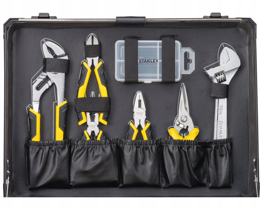 - Верхня кришка : кусачки розвідні 250 мм, бококуси 160 мм, гострогубці 160 мм, комбіновані кусачки 160 мм, ножиці господарські 182 мм, ключ розвідний 250 мм, коробка 112 х 68 х 29 мм (6 відділень 35 х 32 мм) li>
