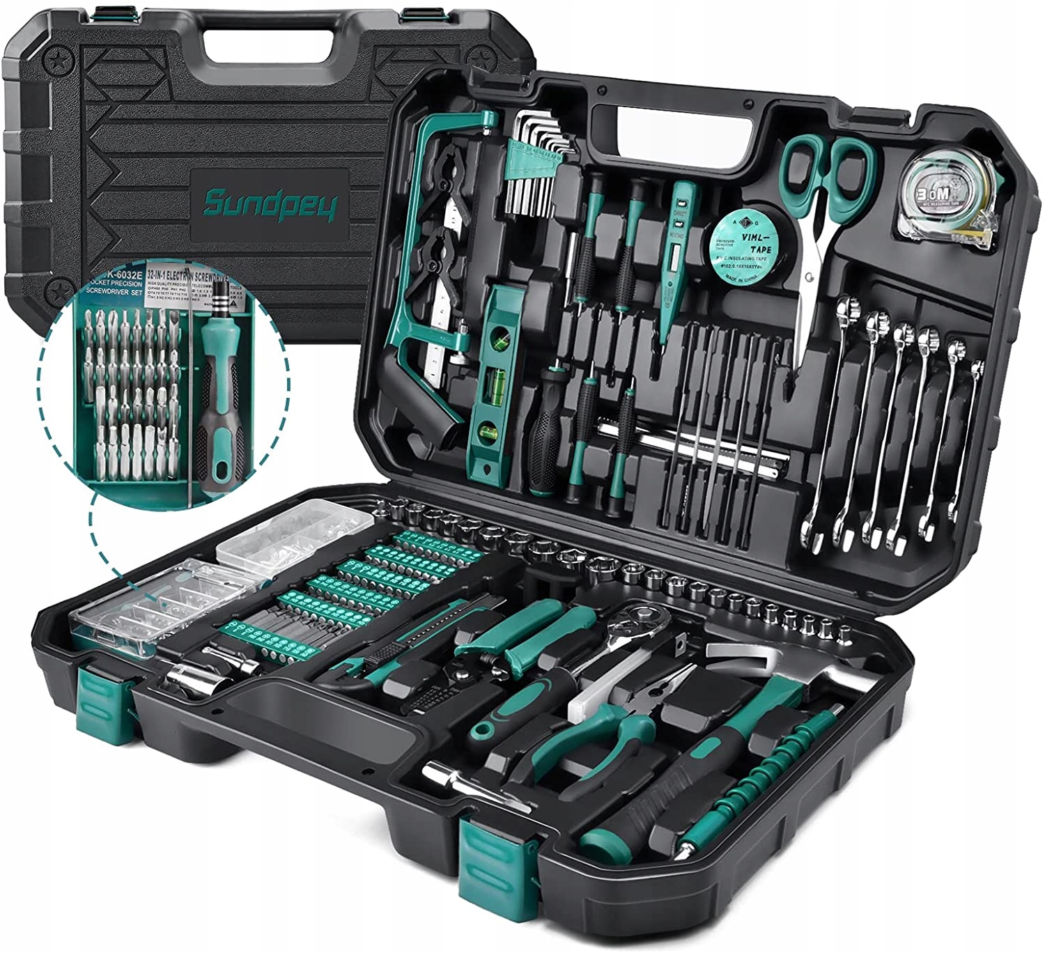 - Повний ящик для інструментів Sundpey 300pcs включає тріскачку, набір тріскачок, рулетку, ізоляційну стрічку, рівень, прецизійну викрутку, молоток, стриппер, детектор напруги, набір гайкових ключів, перехідник із тріскачкою, шестигранні ключі тощо. Наповнений основними інструментами на будь-який випадок.