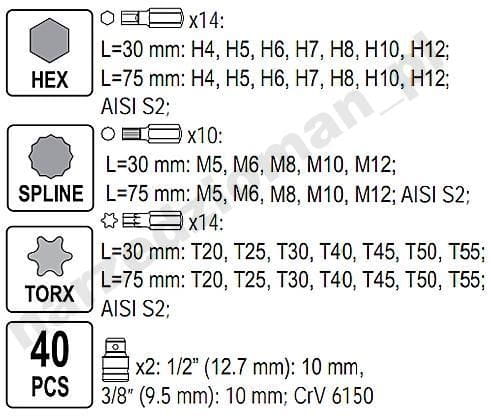 Набір біт для відкручування спец. тип гвинтів: шестигранник, торкс, шлицеві. Різноманітність насадок дозволяє виконувати багато робіт в спеціалізованих механічних і автосервісах. Наконечники мають дві довжини: 30 і 75 мм, встановлені в шестигранний тримач 10 мм, адаптований для роботи з тріскачкою 1/2" і 3/8".