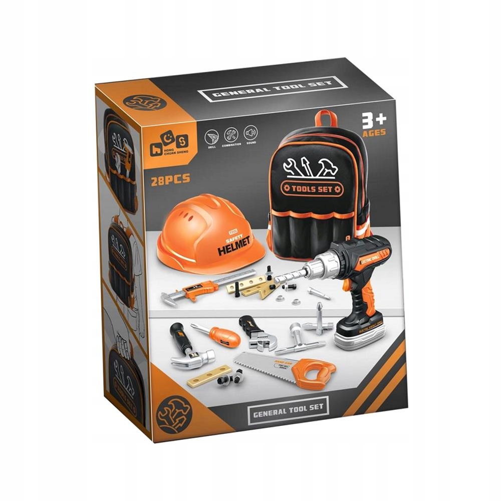 Набір з 28 елементів, включаючи дриль/шуруповерт і кілька змінних наконечників, каску, пилку, молоток, викрутку та мірну стрічку. Все зібрано в рюкзак. Для дрилі/шуруповерта потрібні батарейки - 2xAA (не входять в комплект)