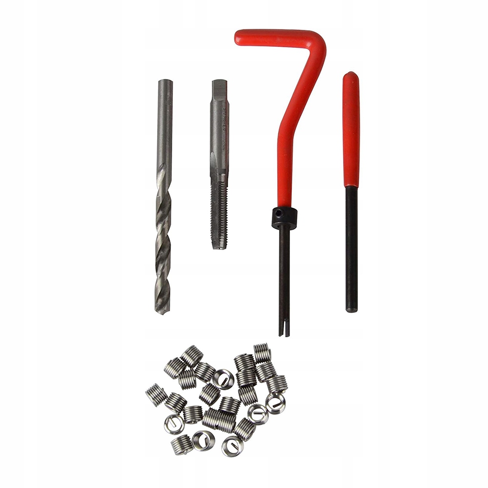 Цей ремонтний набір включає монтажні вставки, дротяні різьбові вставки, спіральні свердла, мітчики, інструменти для ламаються виступи.