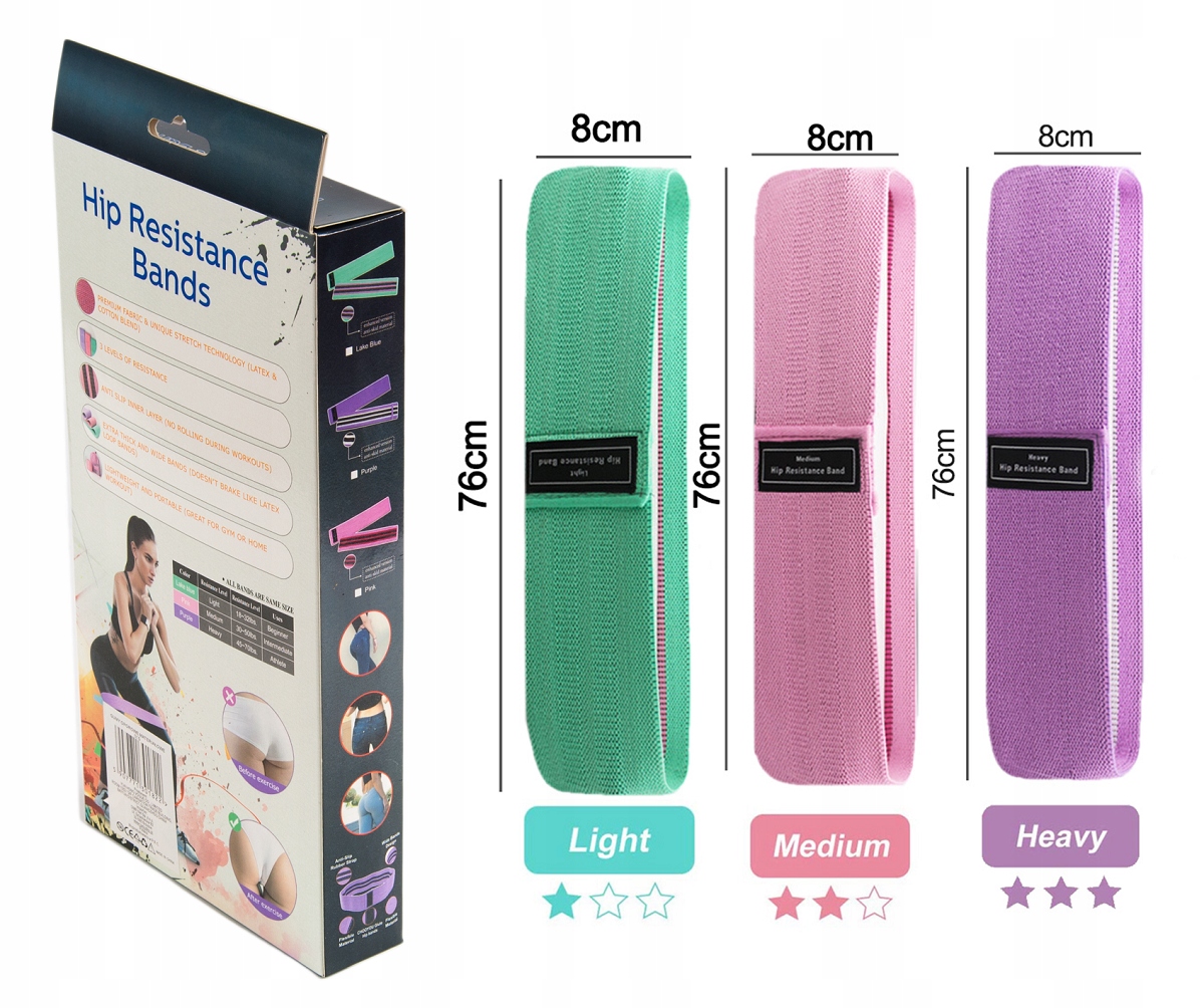- СПЕЦИФІКАЦІЯ – 3шт.; матеріал: поліестер + латексна гума; 3 рівня сили опору; розміри: 8/38см; обхват: 76 см; вага: 0,369 кг.