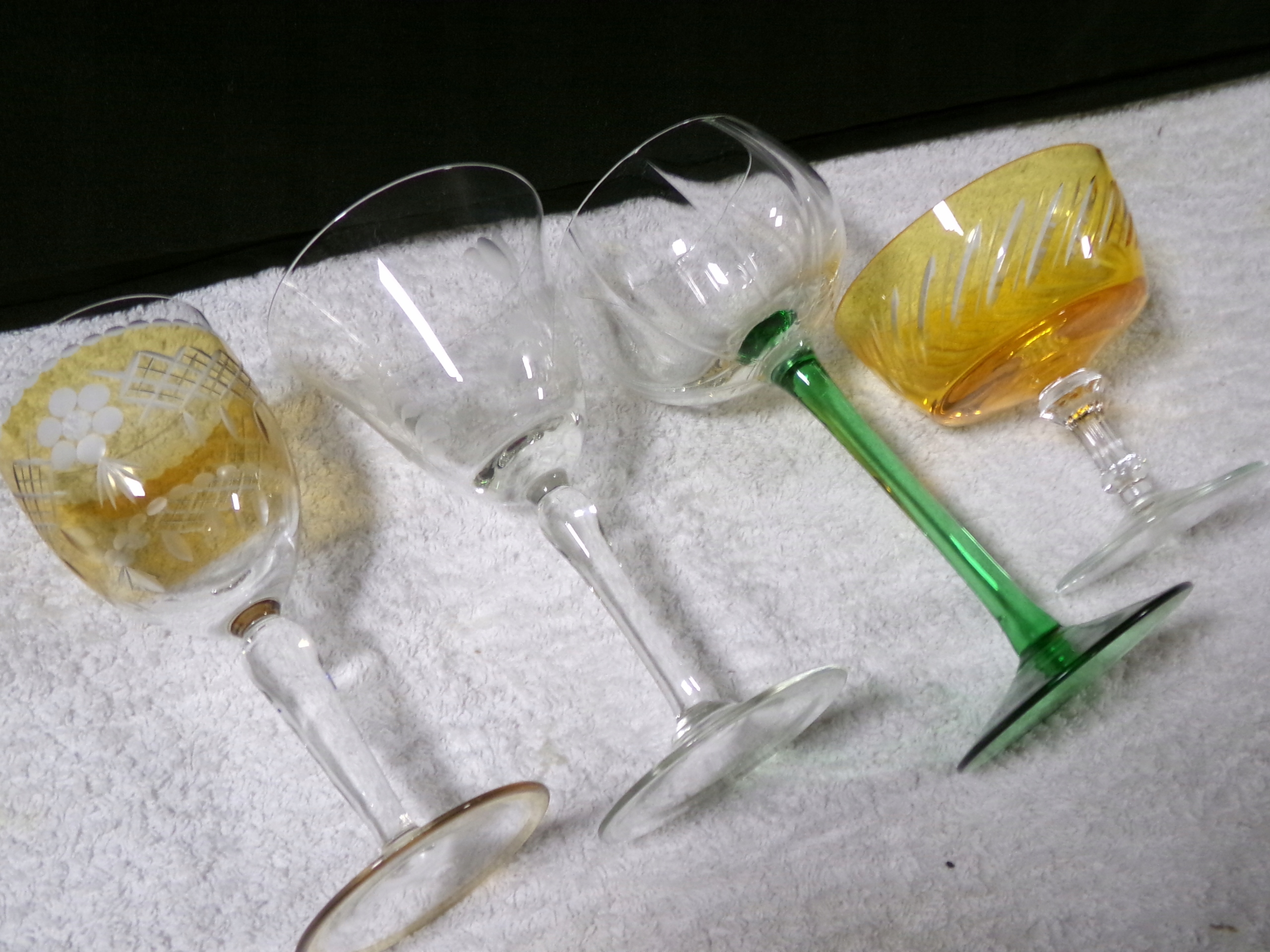 Набір із 4 склянок із скла з висотою від 9,5 до 17 см, діаметром від 6 до 8 см, вагою 0,44 кг. Дуже хороший стан збережений, без пошкоджень.