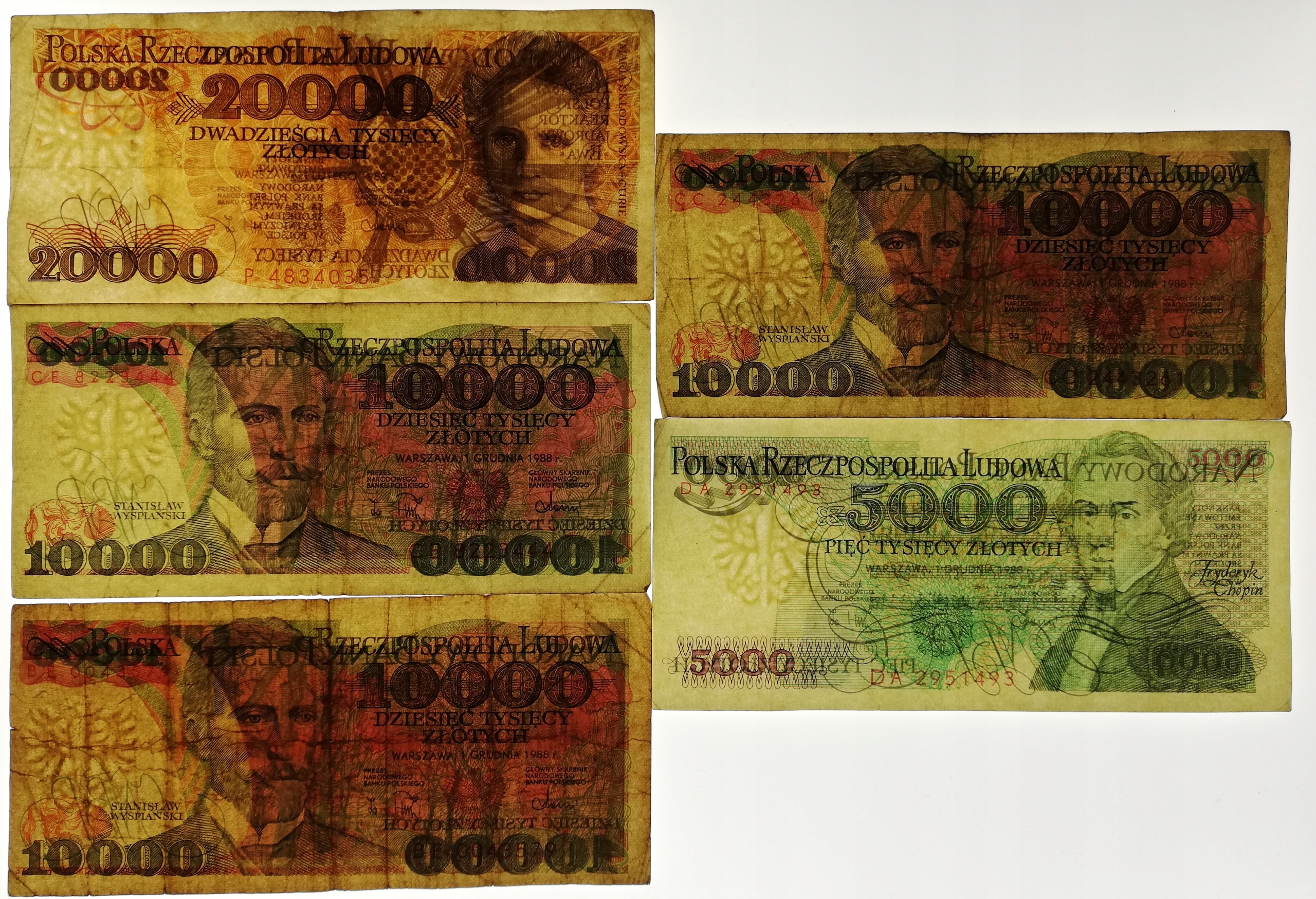 Набір із 5 банкнот Польської Народної Республіки, 20 000 злотих, серія P, 3 x 10 000 злотих, 5 000 злотих, 1988-1989 рр.