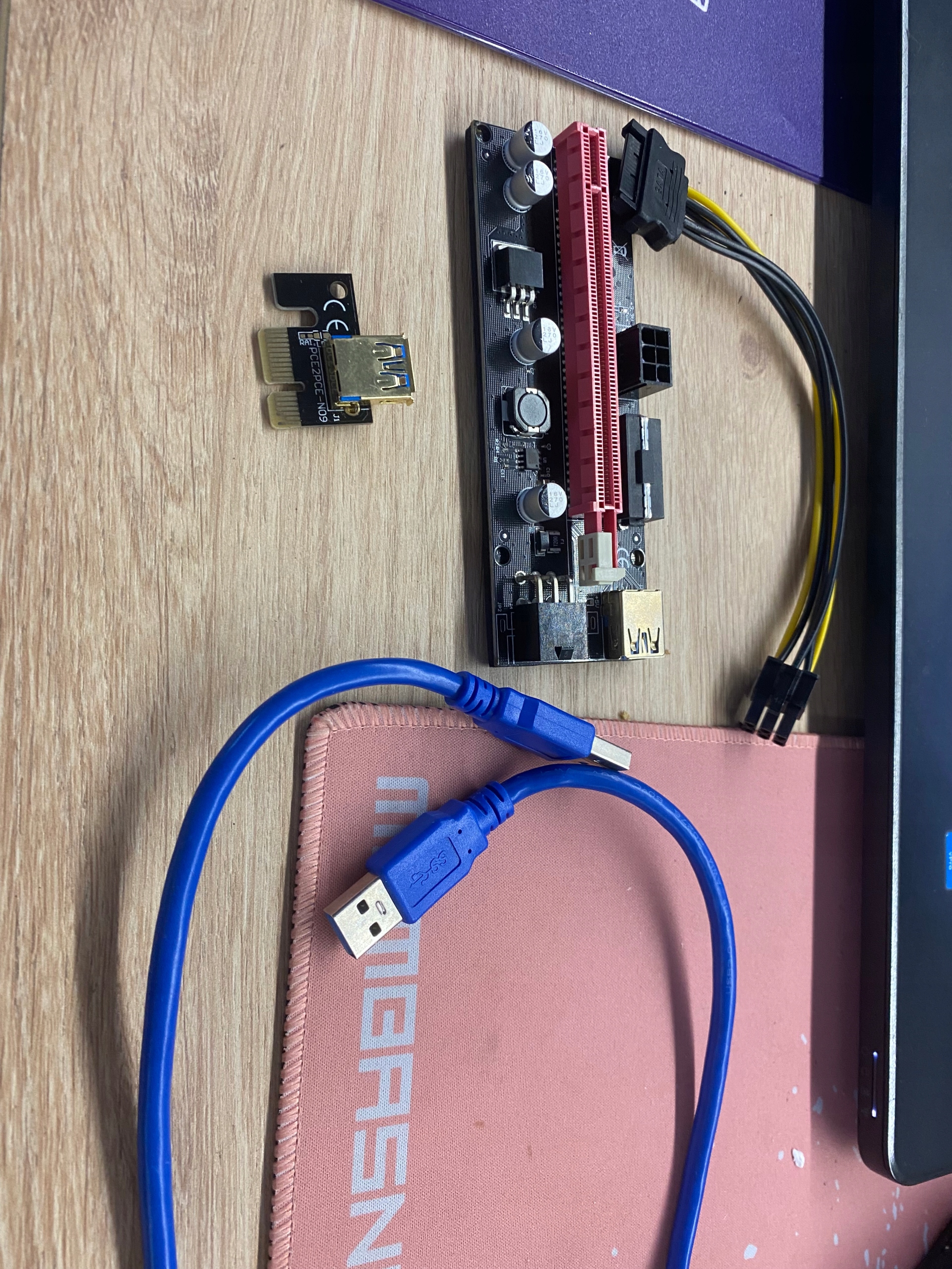 Riser має гніздо PCI-E 16x, вхід USB 3.0 і 4-контактний вхід живлення 6PIN, Sata і Molex.