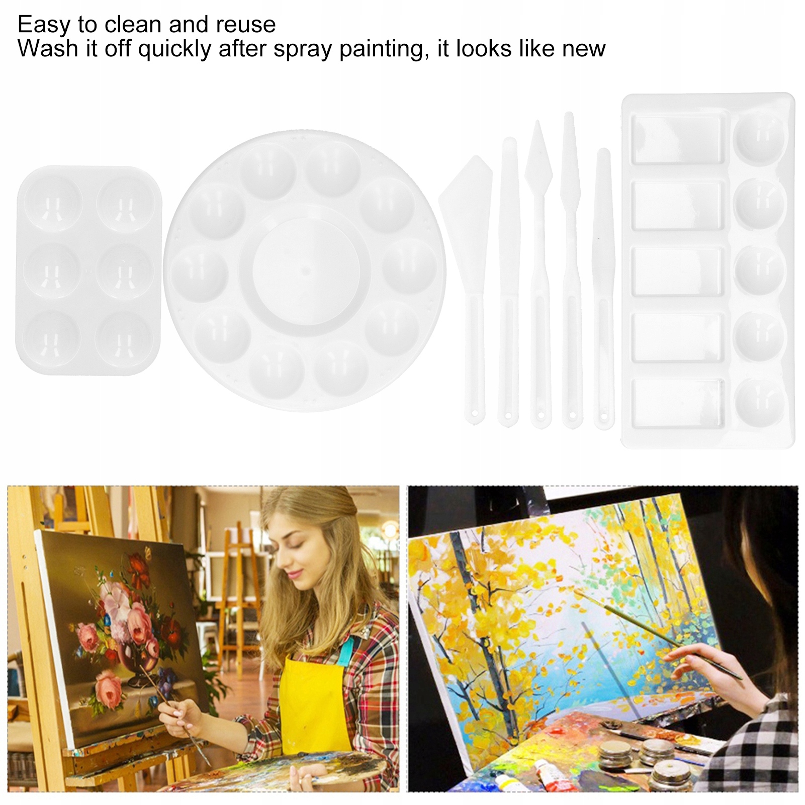 1. Палітра та ножі доступні в різних розмірах і формах для зручності та легкого зберігання. 2. Ці матеріали для малювання ідеально підходять для всіх видів малювання та рукоділля, а також для професійних костюмів. 3. Він підходить для аматорів і професійних художників і може допомогти їм вивести свої проекти на новий рівень. 4. Виготовлений з товстого і міцного пластику, відмінно підходить для нанесення і змішування фарб. 5. Його легко чистити та використовувати повторно, а після фарбування швидко змивається та виглядає як новий.