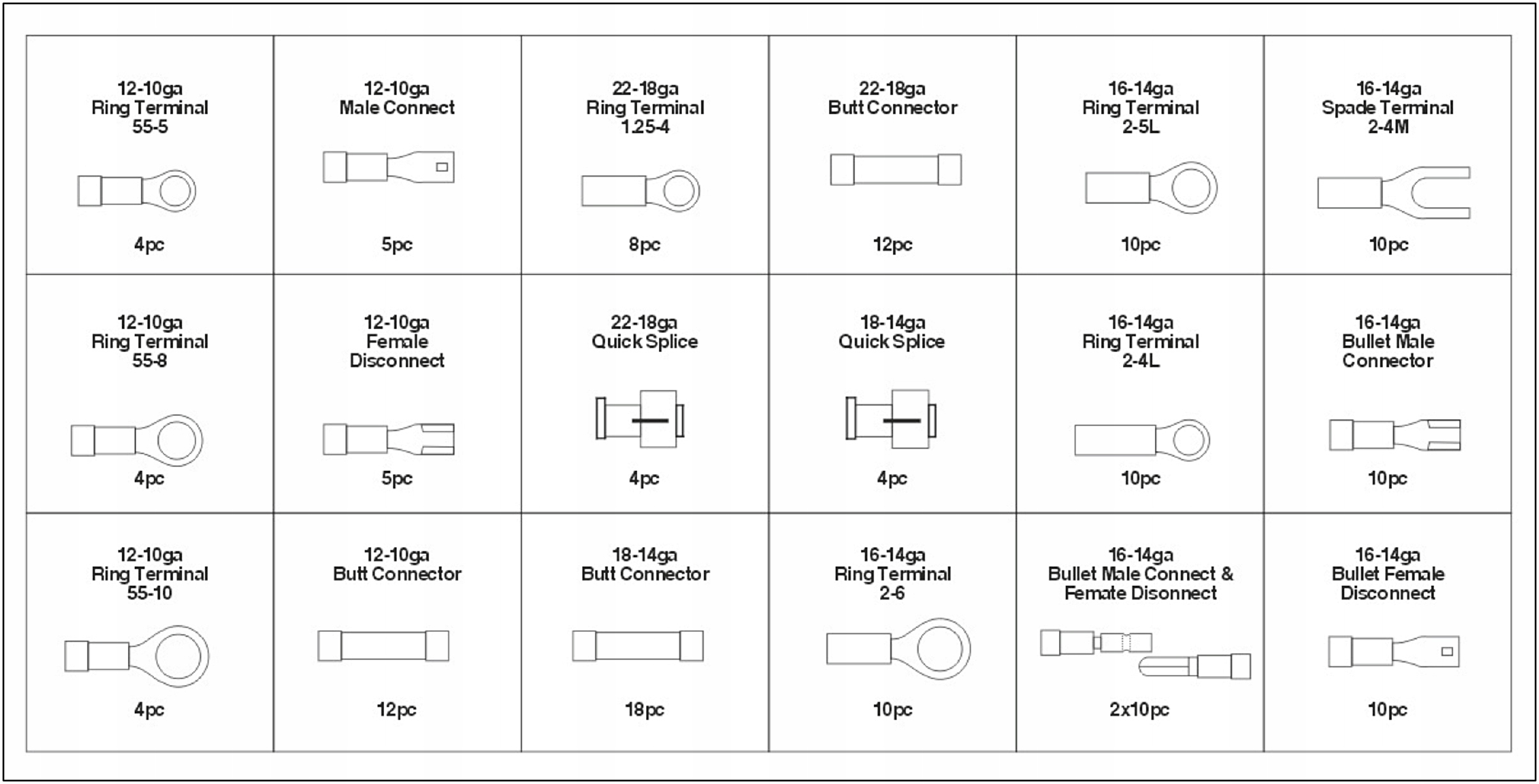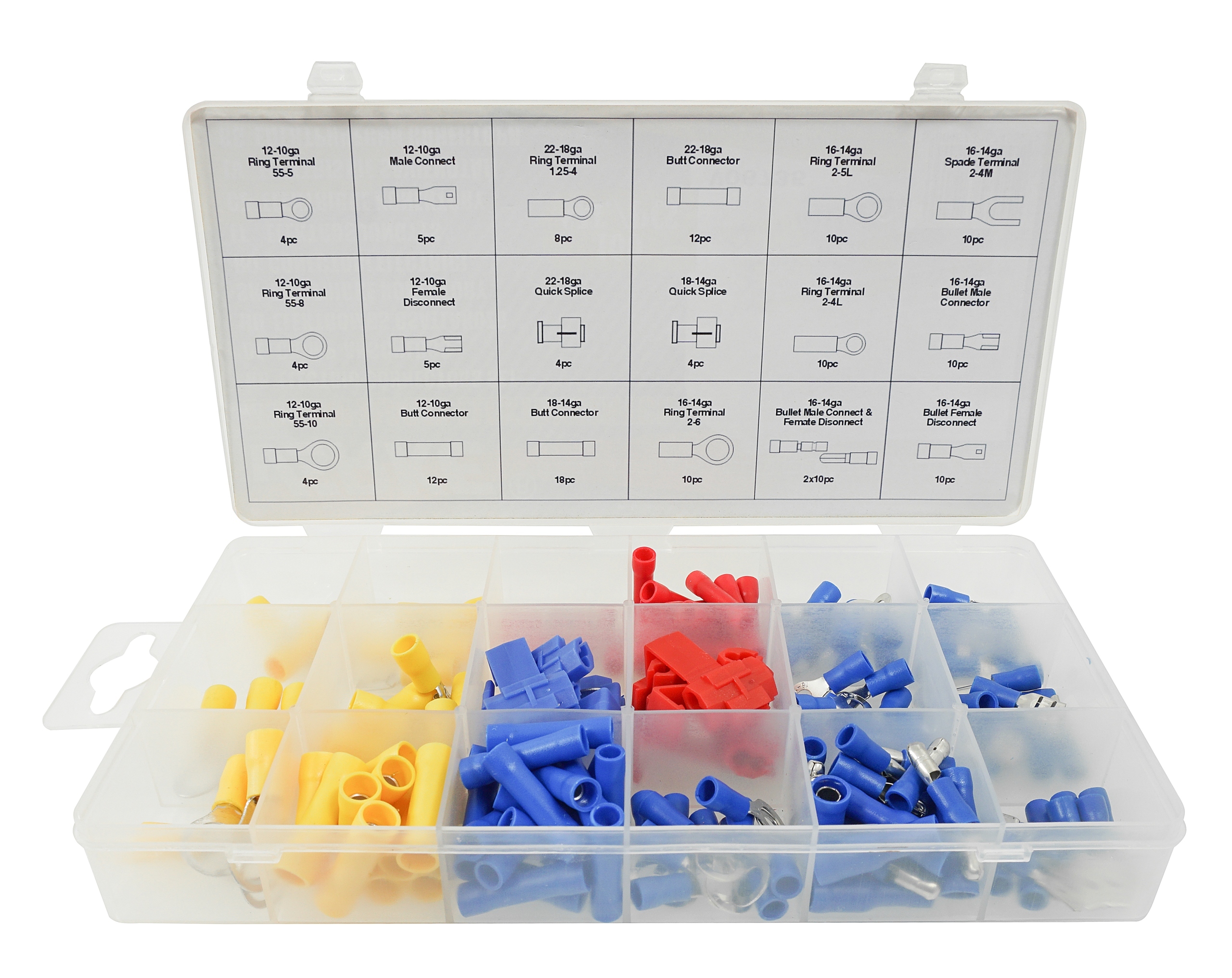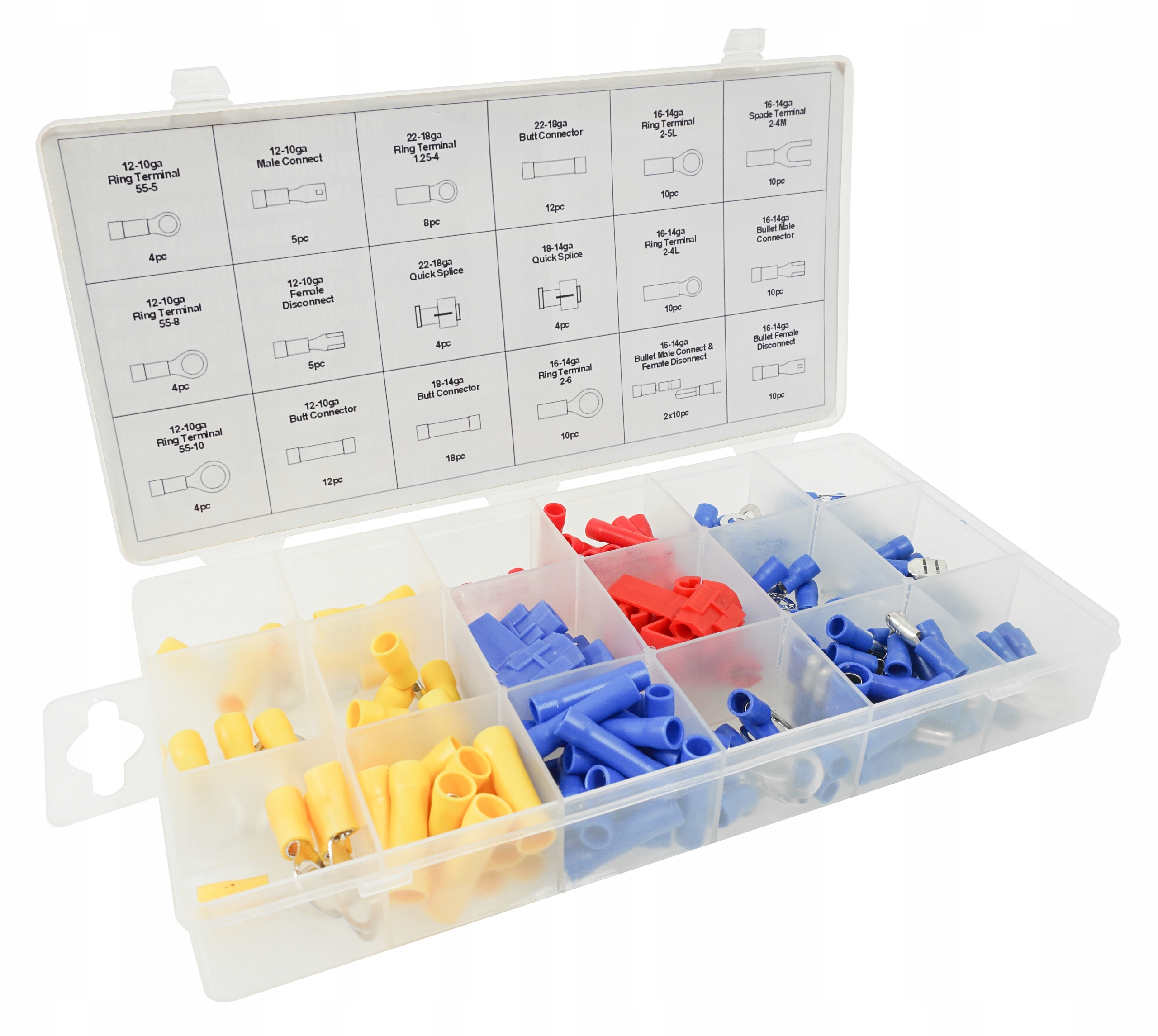 Універсальний набір роз'ємів та електричних роз'ємів для використання електриками та механікою в пасажирських автомобілях, вантажівках та будівельних машинах.