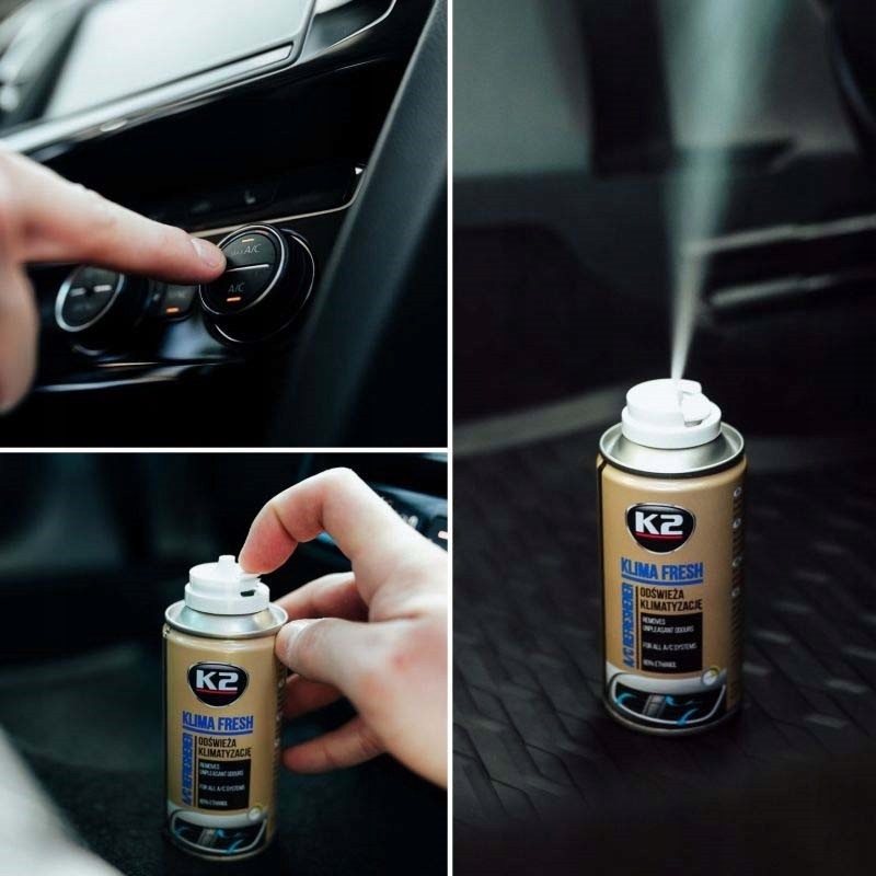 K2 Klima Fresh 150ml - це надійний спрей для освіжання кондиціонера, який протягом десятка-інших хвилин видаляє неприємні запахи, вологу та мікроорганізми з вентиляційної системи. Без розбирання та використання інструментів, просто увімкніть рециркуляційний кондиціонер і залиште спрей у салоні - простий спосіб очистити повітря. Продукт підходить для всіх типів кондиціонування - ручного, автоматичного і багатозонного. Після використання салон автомобіля набуває свіжого аромату, напр. лимонний або квітковий, що значно підвищує комфорт водіння.