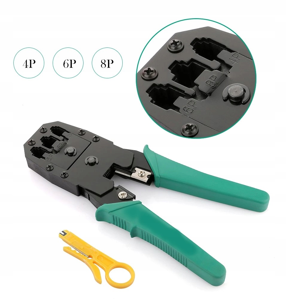 - Крімпер RJ9/RJ11/RJ12/RJ45, вбудований знімач і різак