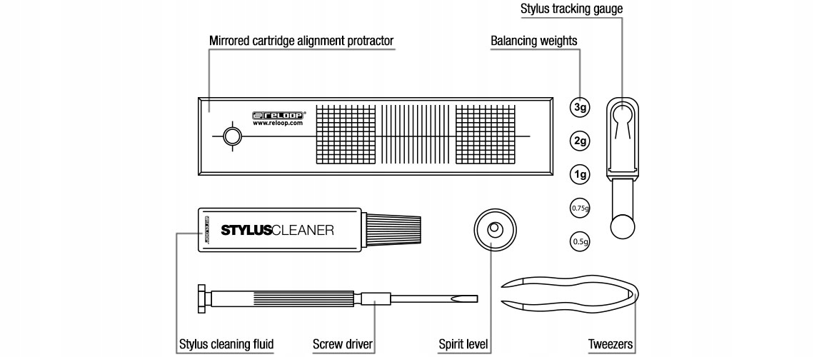 Універсальний набір для калібрування плеча грамофона, тиск голки, вирівнювання та очищення голки грамофона. і все, щоб мати можливість насолоджуватися вашою колекцією вінілу в оптимальному звуці. Щоб досягти цього, грамофонна рука та вставка завжди повинні бути оптимально встановлені та регулярно доглядати. Набір картриджів Reloop Mountlide та калібру містить усе, що потрібно для встановлення та догляду за системою грамофону.