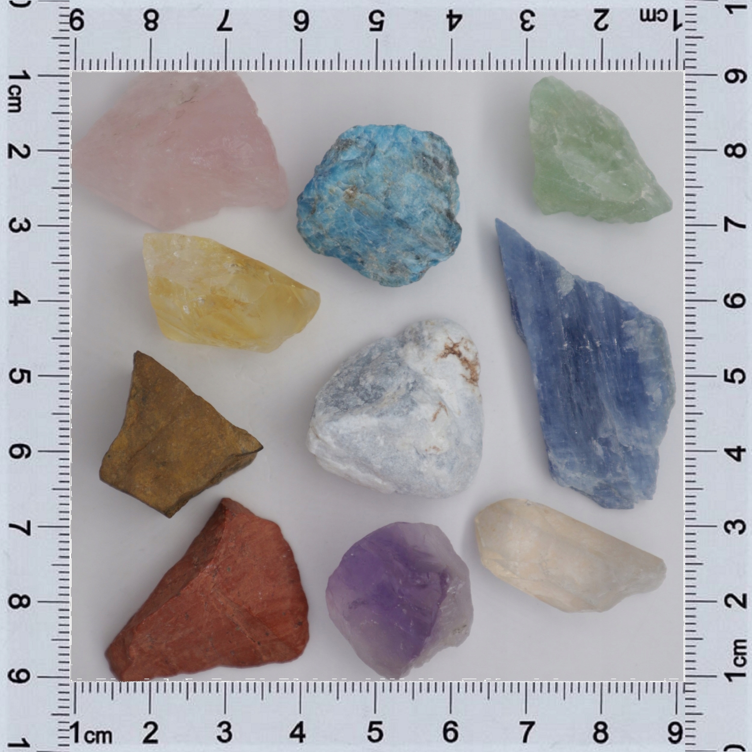 Камені натуральні, необроблені, розміром на долоню (1,5-2 см). Камені вибираються випадковим чином, кожен набір складається з 10 описаних каменів. На фото приклад набору в коробці розміром 10х10 см.