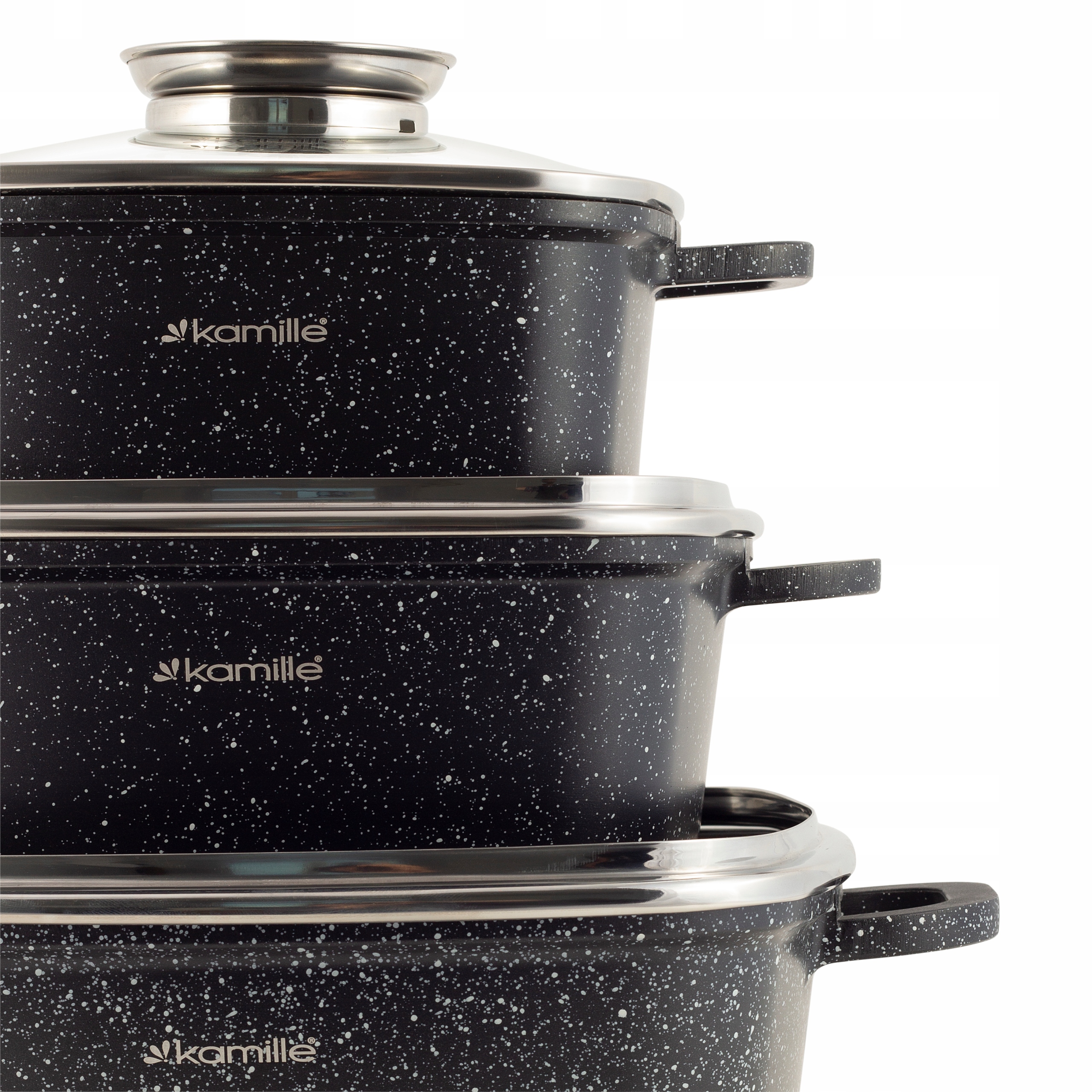 Набір каструль Kamille з мармуровим покриттям - зручно і практично у використанні. Каструлі дуже міцні, стійкі до механічних навантажень, що значно підвищує їх довговічність.
