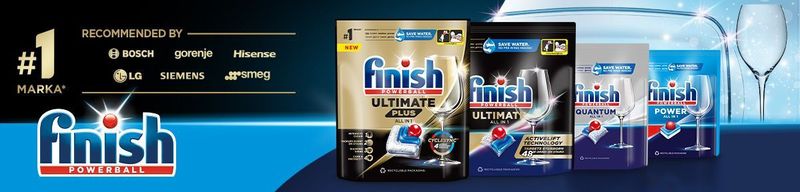Finish — бренд номер 1*, рекомендований такими виробниками посудомийних машин, як: Bosch, Gaggenau, Gorejne, Neff, Siemens, Smeg