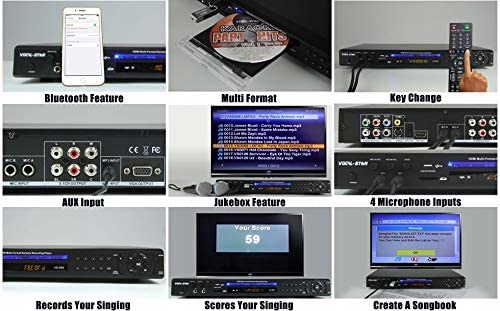 - VS-800 — це широкоформатна караоке-машина, яка відтворює будь-який караоке-диск, а також дозволяє співати пісні з телефону/планшета після підключення через вбудований Bluetooth або вхід AUX. Співайте тисячі пісень із таких веб-сайтів, як YouTube, Spotify тощо, і записуйте вокал із фоновою музикою безпосередньо на свій USB-пристрій.