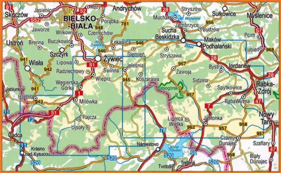 Набір із трьох складних туристичних карт, опублікованих Compass: Сілезькі Бескиди та Велика Рача в масштабі 1:50 000, Живецький Бескид у масштабі 1:50 000 та Бескид Малий у масштабі 1:40 000.