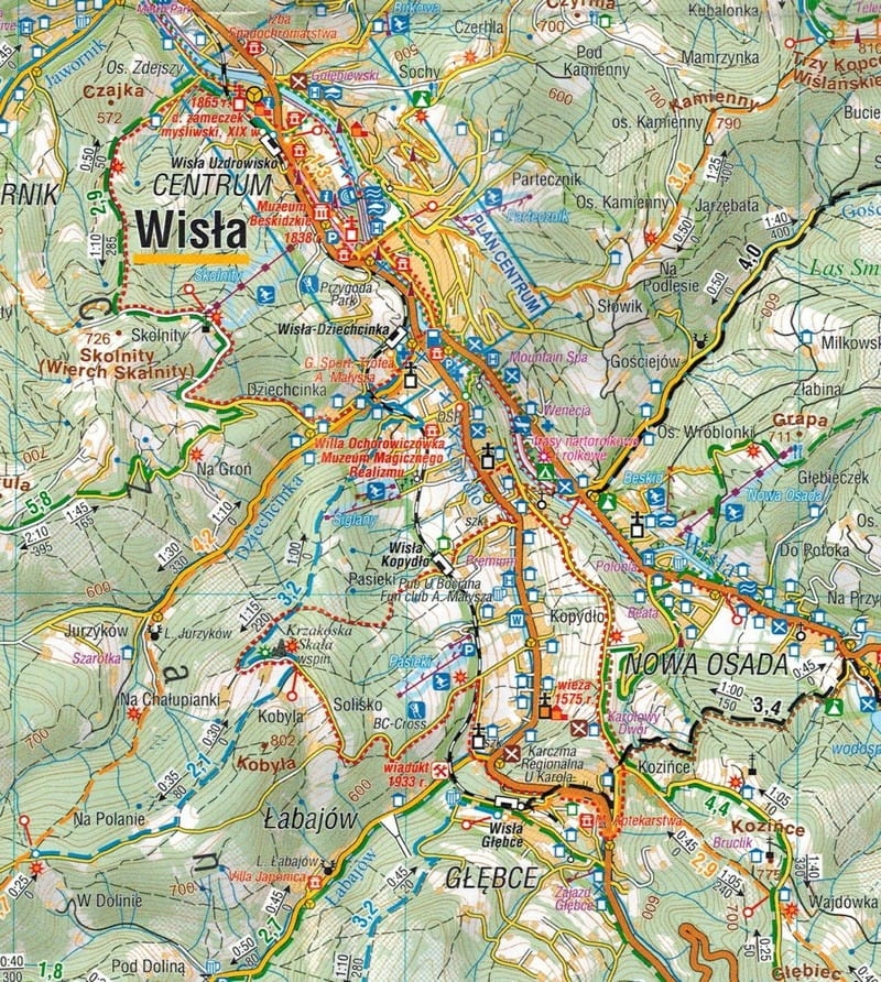 Зворотний бік містить обширний туристичний путівник, що містить основну інформацію про регіон. Опис збагачений кольоровими фотографіями. Крім того, є плани центрів міст: Бельсько-Бяла, Бренна, Істебна, Щирк, Устронь, Вісла.