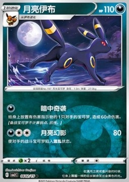 Умбреон рухається в тіні - буквально. Це темна еволюція, яка активує свої здібності у світлі місяця. Тихий і спокійний, але здатний швидко взяти під контроль бійку. Загадковий, відданий і сильний.