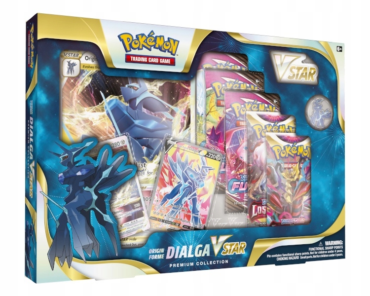 - 1 рекламна картка: Origin Forme Dialga VSTAR у версії з фольги - 1 рекламна картка: Origin Forme Dialga V у версії з фольги - 1 велика картка: Origin Forme Dialga VSTAR у версії з фольги - 5 бустерів Pokémon TCG - Діалга шпилька - Тег Vstar