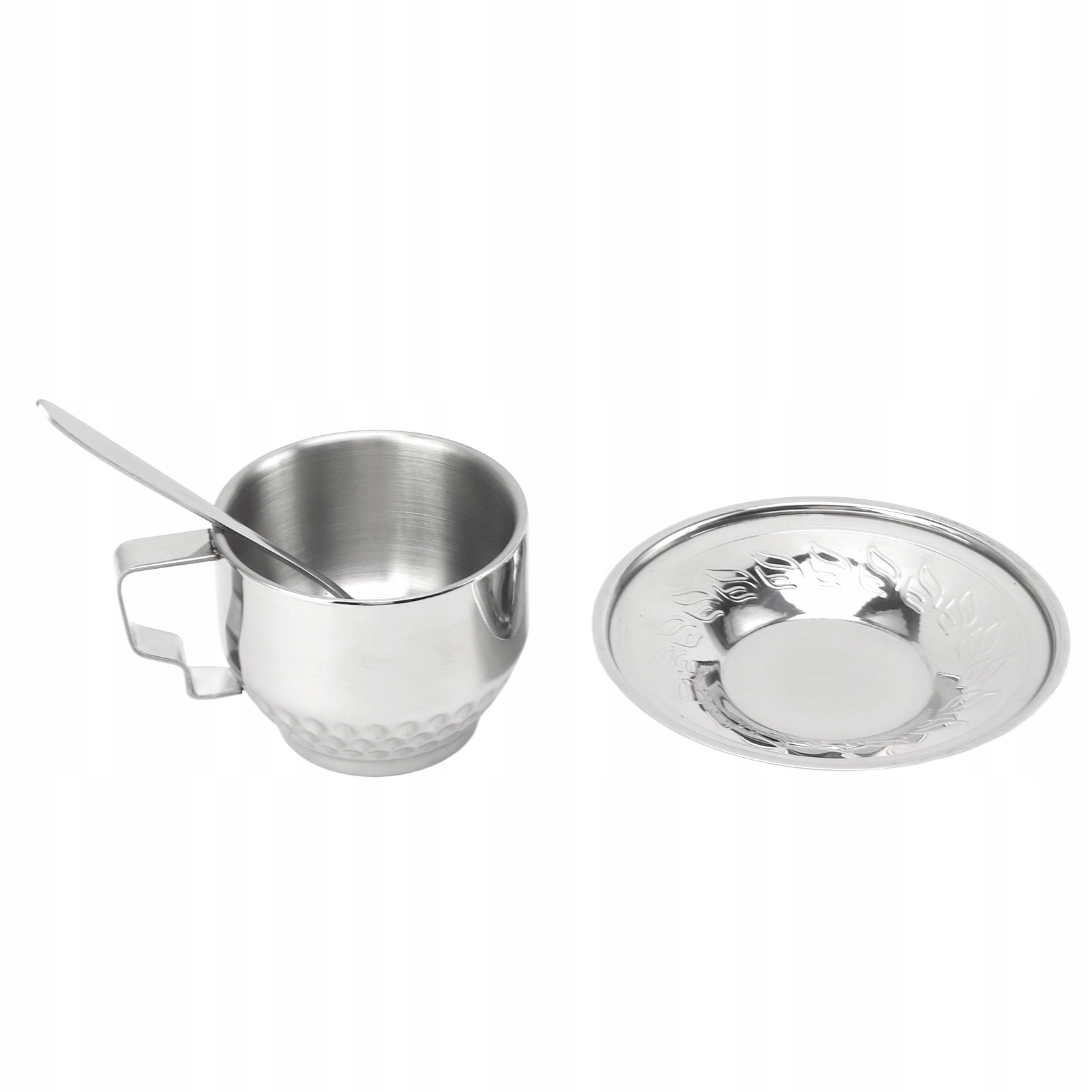 5. Набір із трьох предметів: кожен набір продуктів включає чашку для кави з нержавіючої сталі, блюдце з нержавіючої сталі та ложку з нержавіючої сталі для щоденного використання.