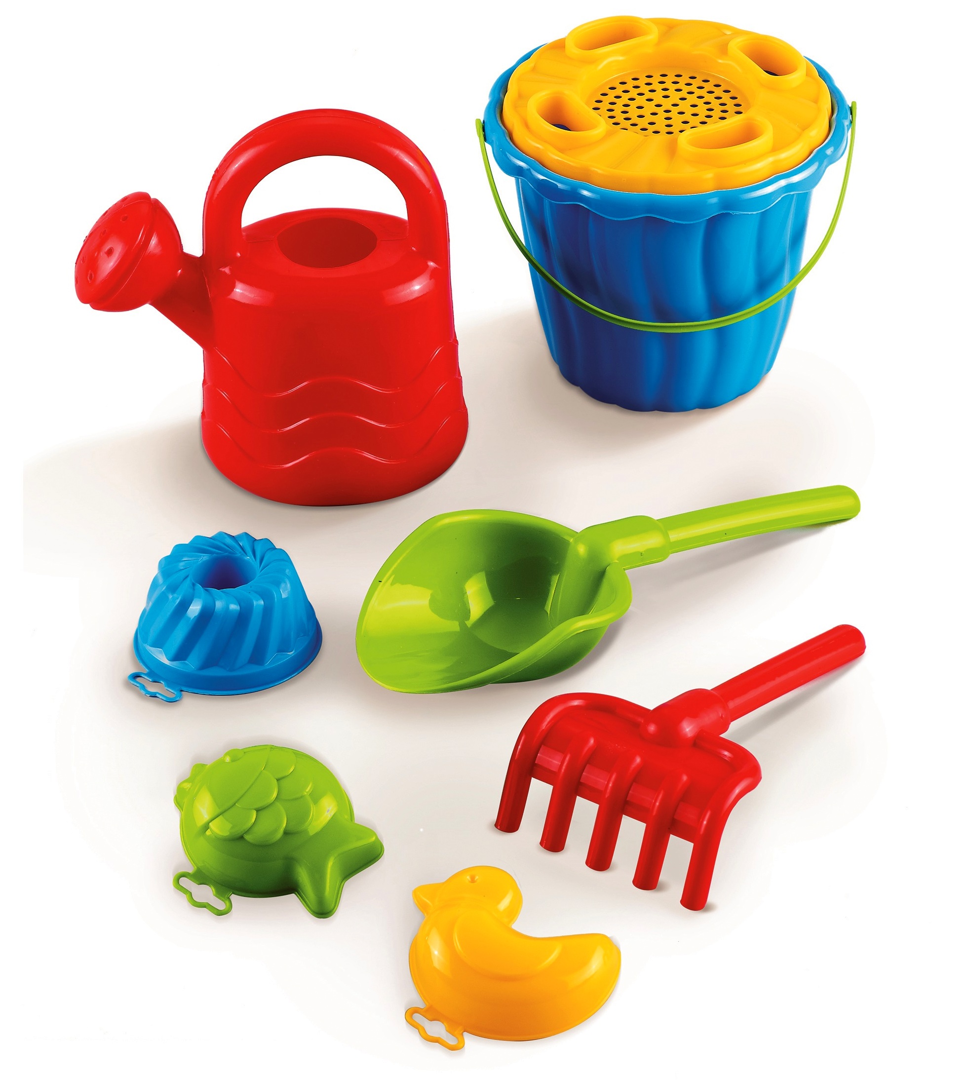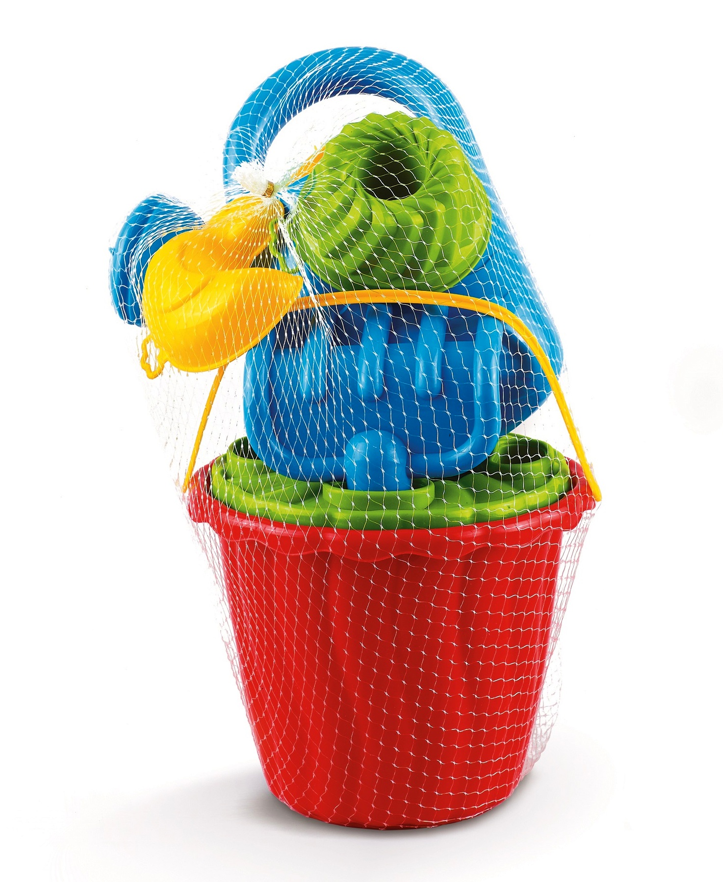 В набір входить: відро з ситечком, лійка, лопата, граблі та 3 формочки