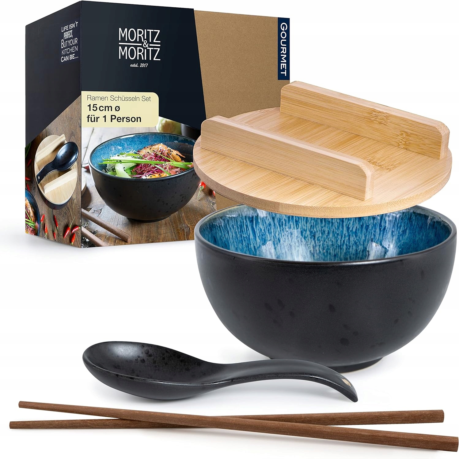 Повний набір для приготування та подачі смачних азіатських страв, переважно рамену. Набір Moritz & Moritz складається з керамічної чаші з синьою реактивною глазур’ю всередині, яка ідеально підходить для 600 мл супу чи салату. У набір також входить 1 ложка для рамену, 2 палички для суші та 1 бамбукова кришка, що робить його ідеальним для японської вечірки.