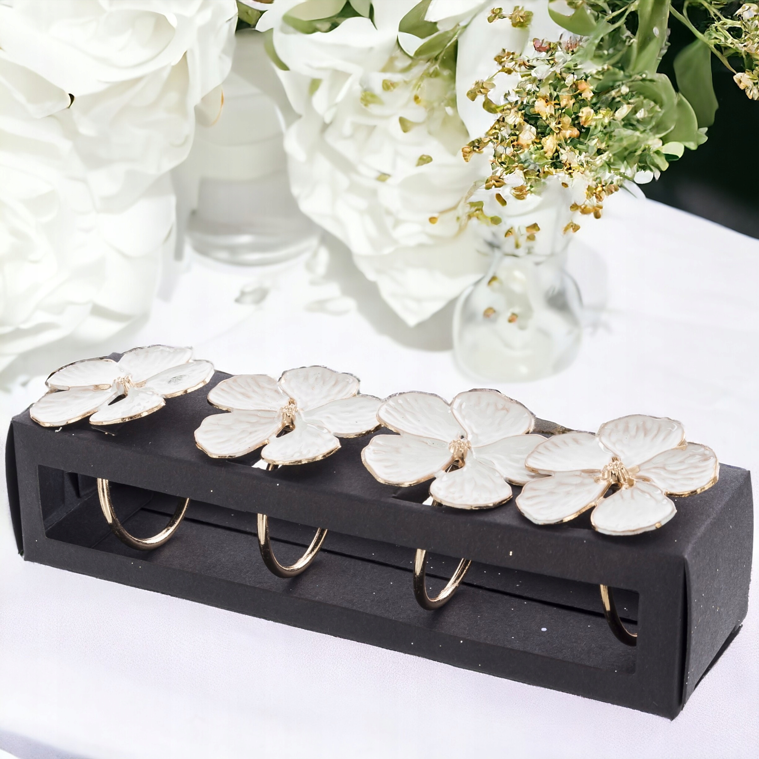 Набір кілець для серветок Золоті та перлинні квіти 4 шт. Ці красиві кільця для серветок зроблять будь-яке сервірування столу неповторним. Їх можна використовувати в багатьох випадках. Ідеально підходить для свят, днів народжень, весіль. Позачасовий, елегантний і дуже декоративний