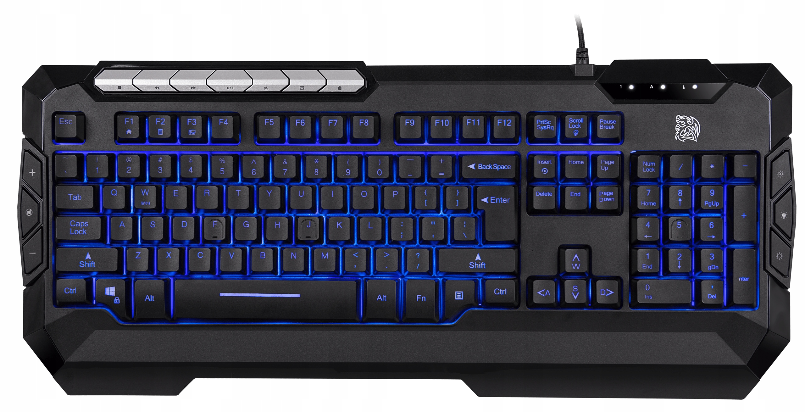 Контролюйте рівні звуку та яскравість підсвічування на льоту за допомогою спеціальні клавіші управління, розташовані з боків. Елементи керування медіа (зупинка/пауза/відтворення) також доступні у верхньому лівому куті. Крім того, WASD і клавіші зі стрілками можна перемикати, щоб їхні функції були взаємозамінними.