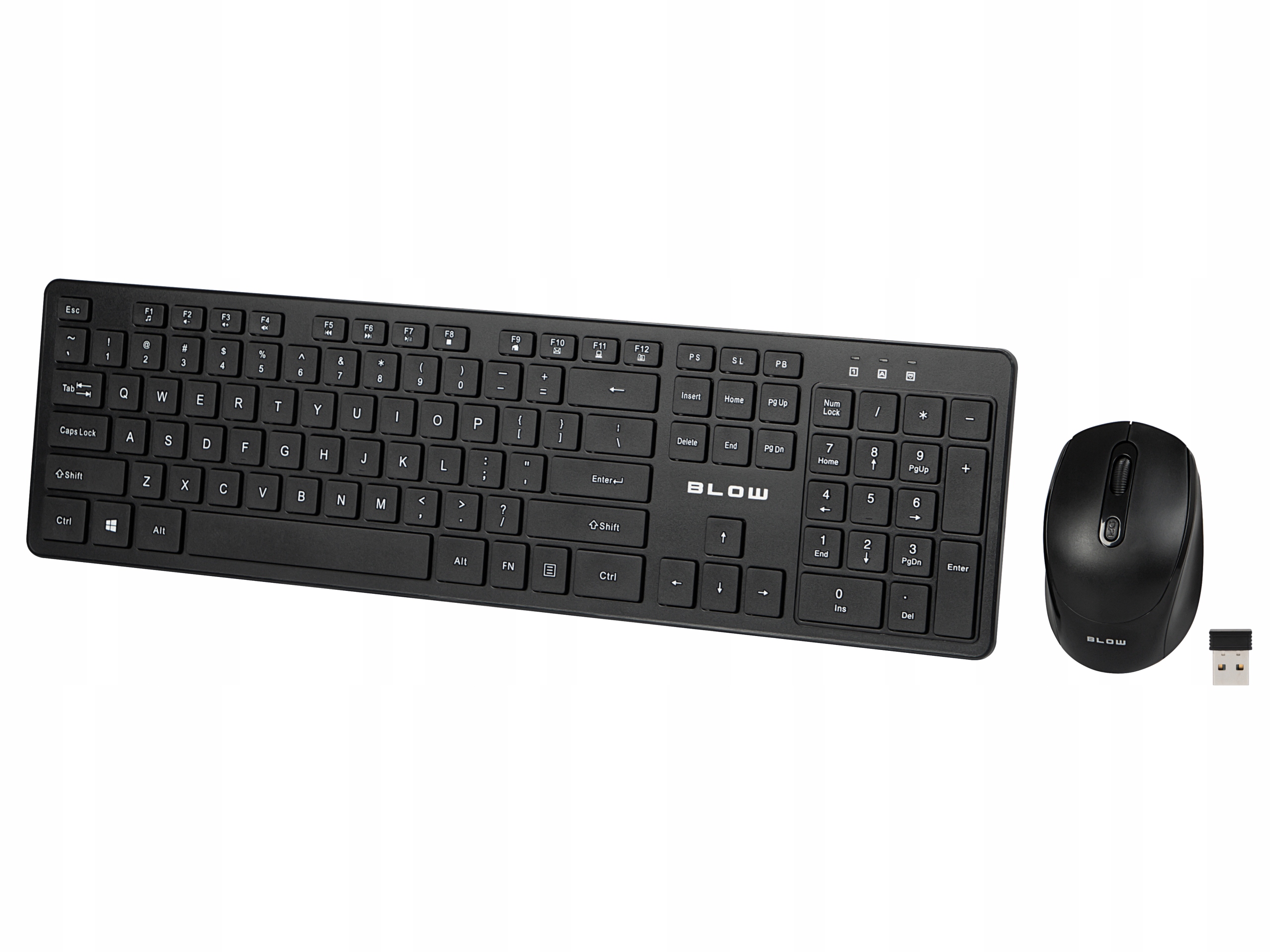 Набір BLOW, що складається з бездротової клавіатури та миші. Пристрої підключаються до ноутбука або комп’ютера за допомогою невеликого USB-приймача. Набір характеризується простим дизайном, зручною роботою та легким використанням.