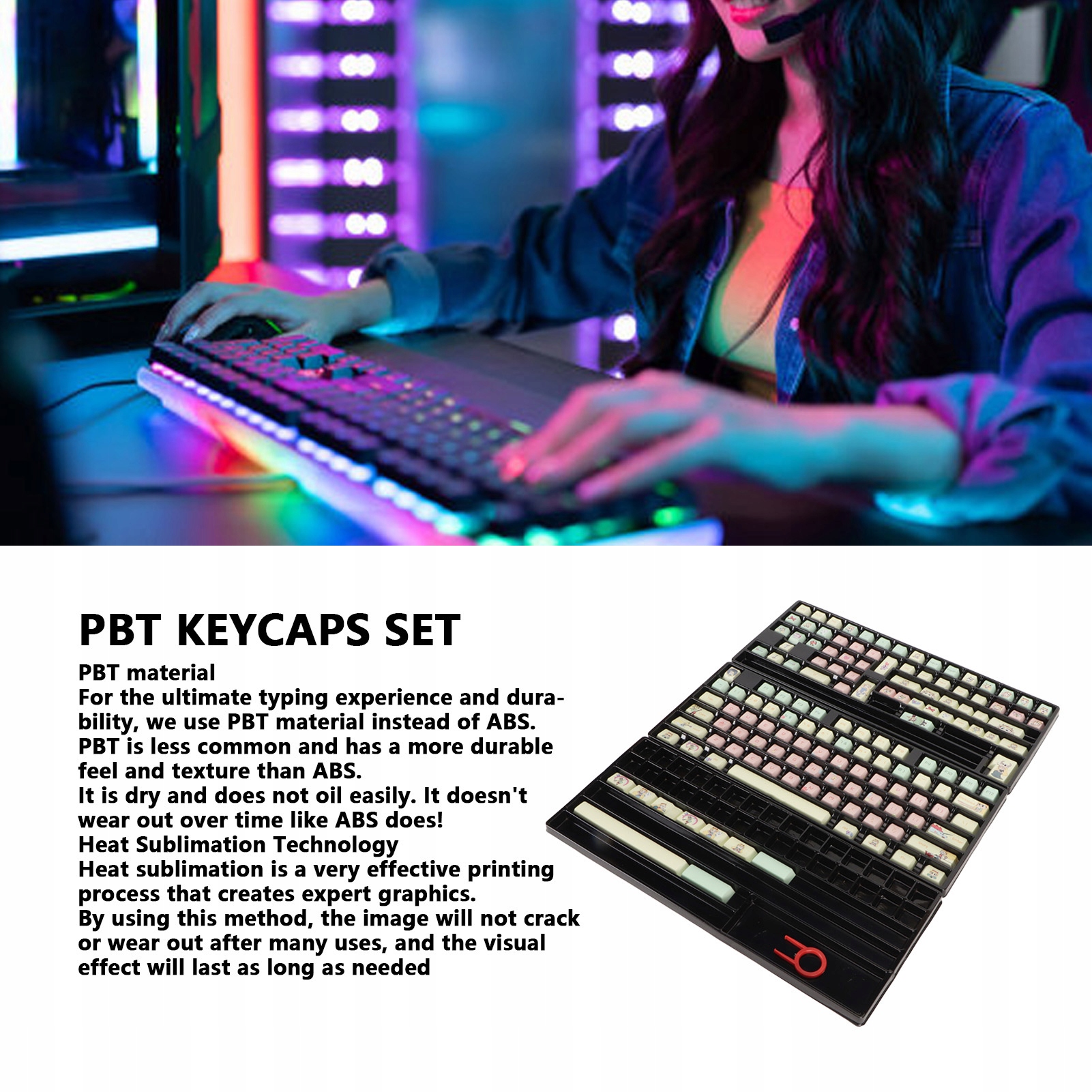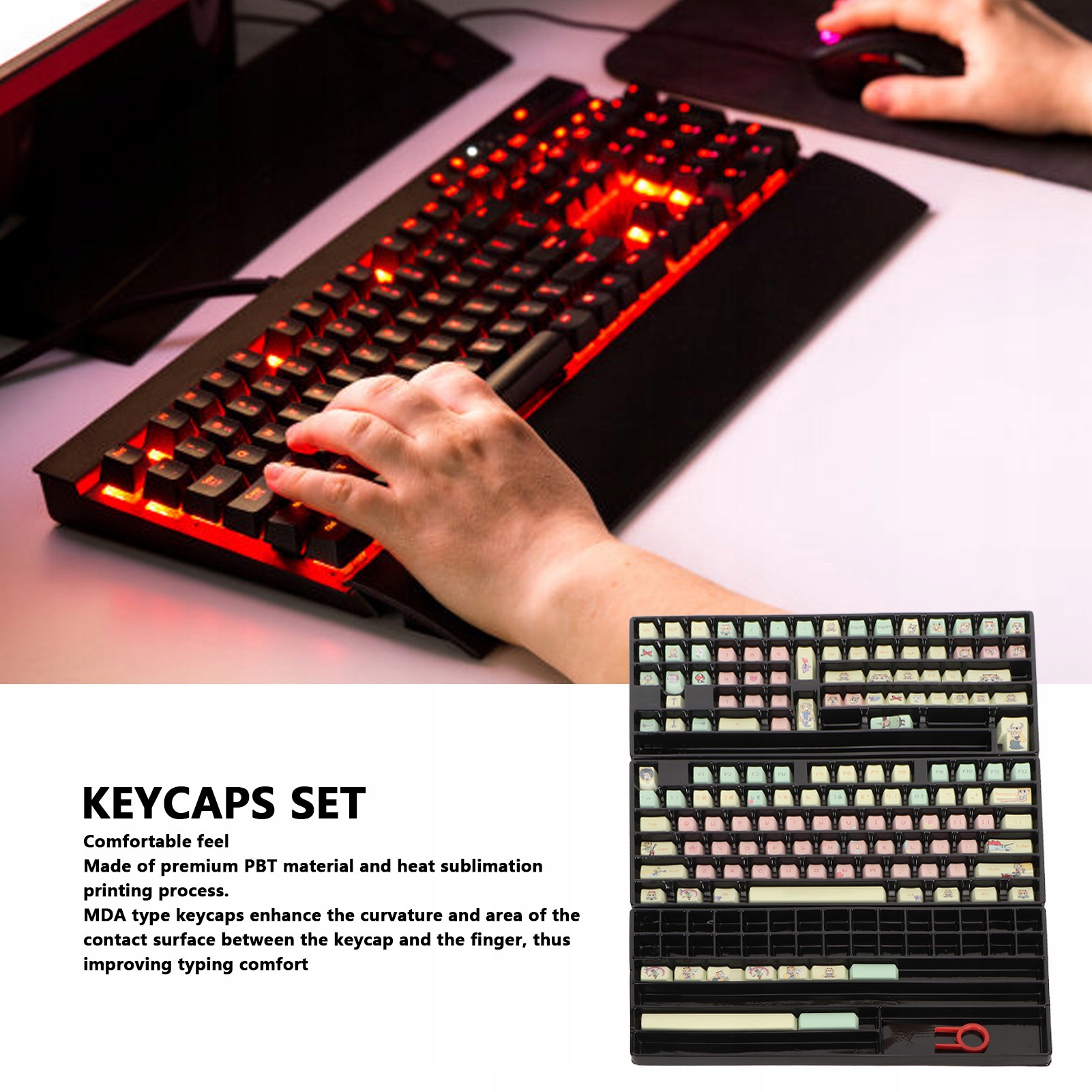 2. Комфортне відчуття: набори клавіатури виготовлені з високоякісного PBT матеріалу та термосублімаційного друку. Клавіатури типу MDA покращують кривизну та площу контактної поверхні між клавішею та пальцем, що покращує зручність друку.